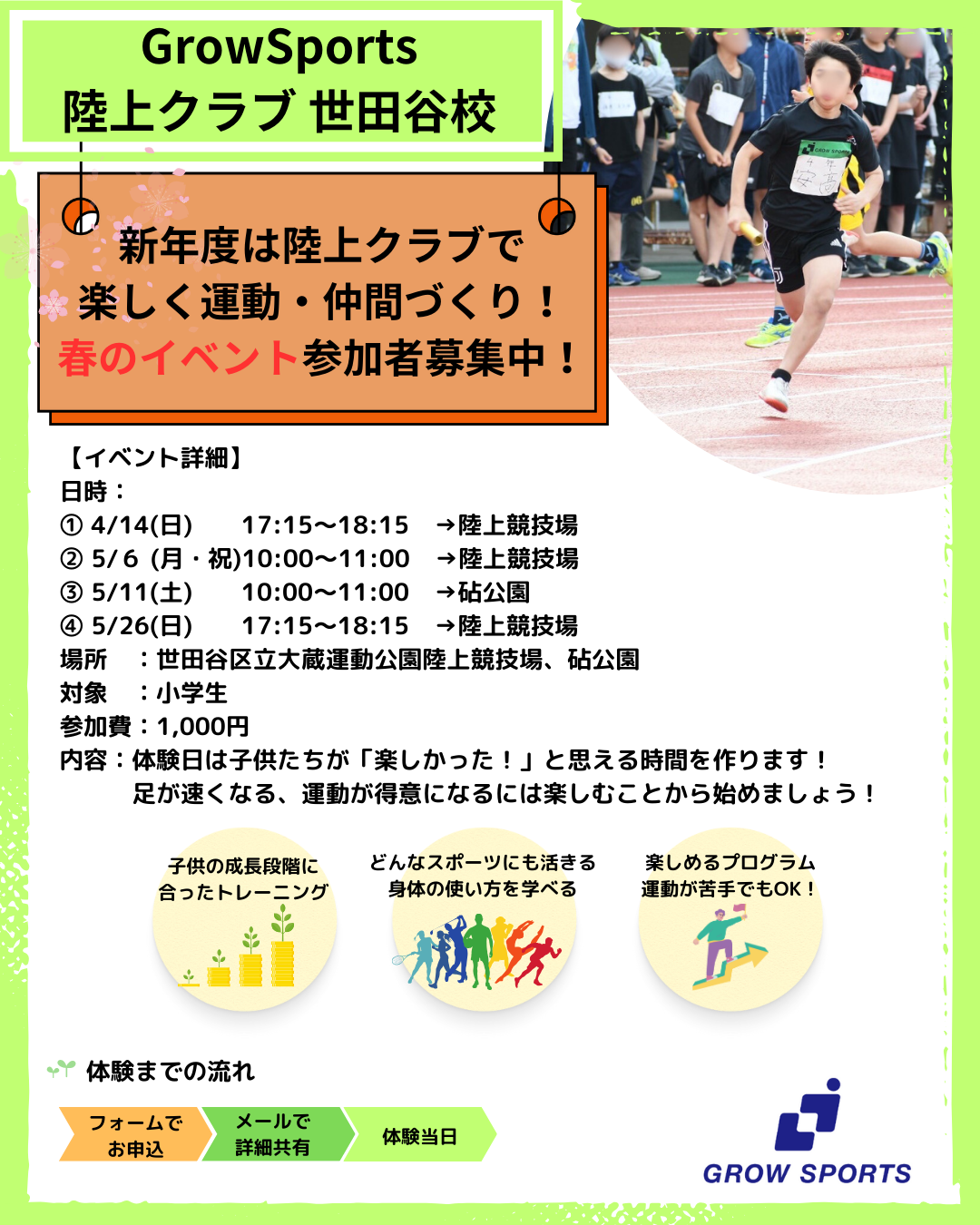 ① 4/14(日)17:15~18:15→陸上競技場② 5/6 (月・祝)10:00~11:00→陸上競技場③ 5/11(土)10:00~11:00→砧公園④ 5/26(日)17:15~18:15→陸上競技場