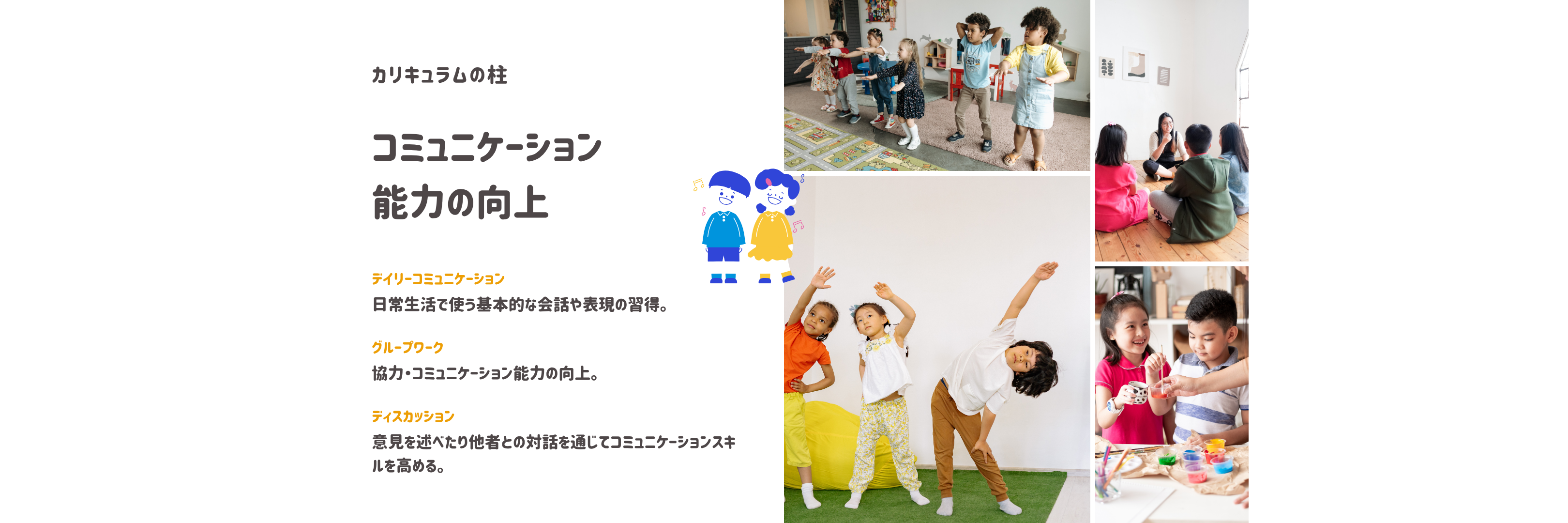 言語形成期の幼児期から英語学習を始めることで、無理なく吸収することができます。この時期の子どもたちは興味のあるものには脅威的な集中力を発揮しますが、同時に飽きっぽさも兼ね備えています。このクラスでは、バラエティー豊かな遊びの要素を取り入れ、さまざまなコミュニケーション活動を通じて子どもたちの英語感覚を養います。