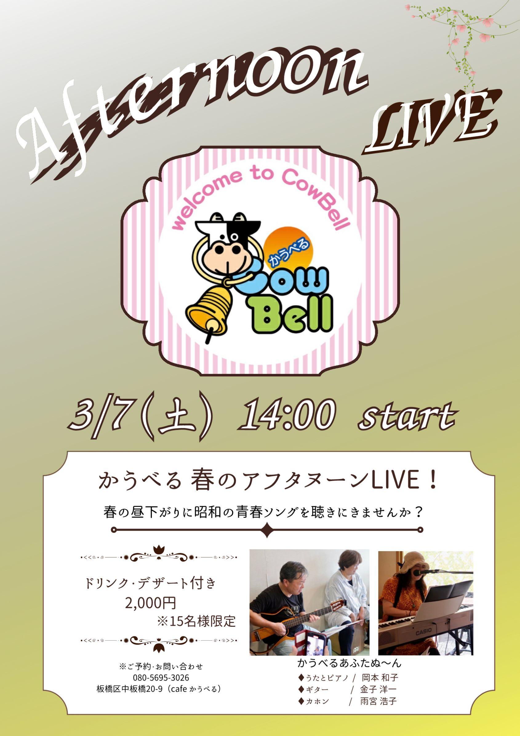 かうべるライブ 出演予定:岡本和子、雨宮浩子、金子洋一 場所:店内 事前にご予約ください |