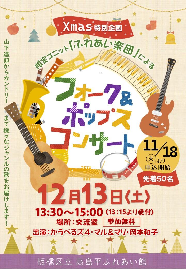 高島平ふれあい館フォーク&ポップスコンサート 場所:高島平ふれあい館 11月18日より高島平ふれあい館にて予約受付 先着50名 |