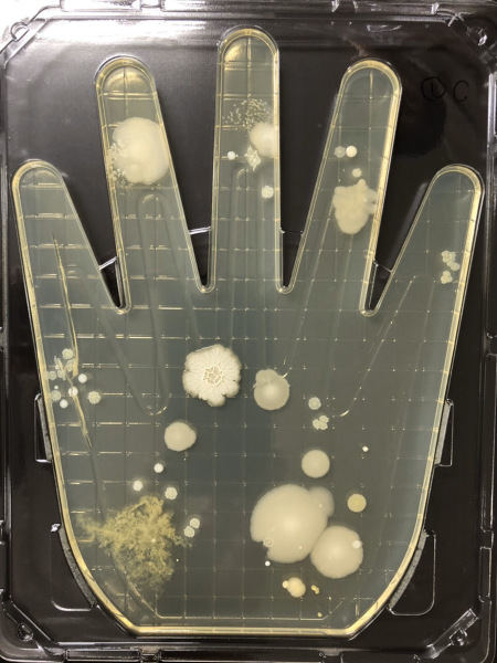 これはアルコール消毒のみを行った手の調査画像です。手のシワに残った汚れが取れていないため、菌が増えてしまっています。もちろんウイルスも増殖しています