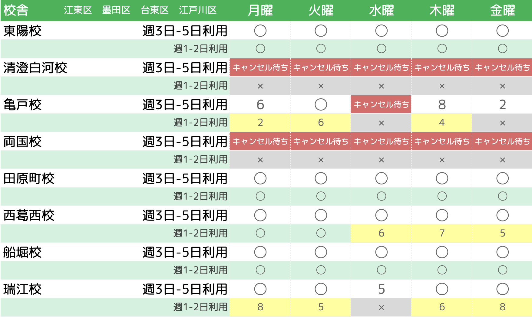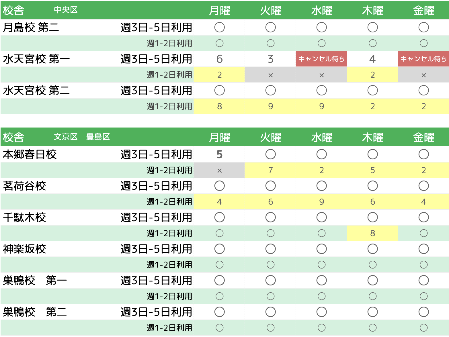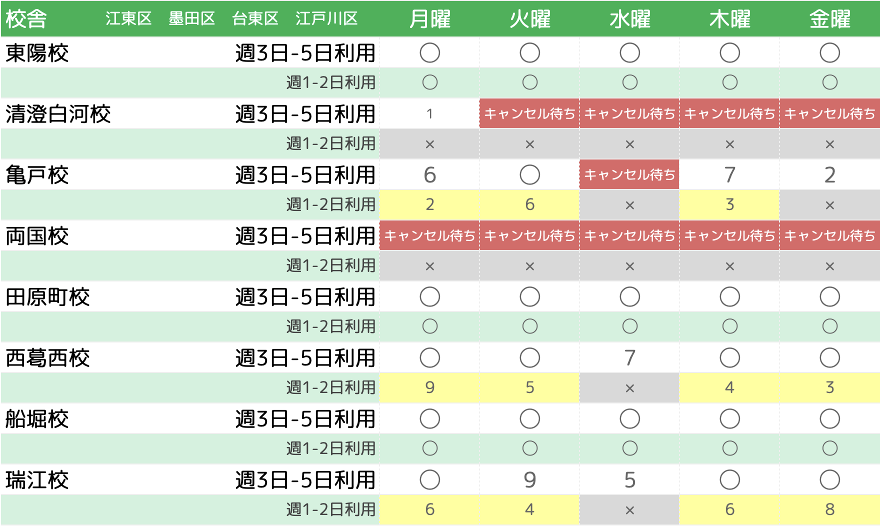 学童は保育園と異なり、小学校1年から6年までの6年間、利用し続けるとは限りません。進学塾や習い事等の理由で毎月、利用状況が少しずつ変化します。リックキッズでは過去の実績を踏まえ予約枠を設定しています。