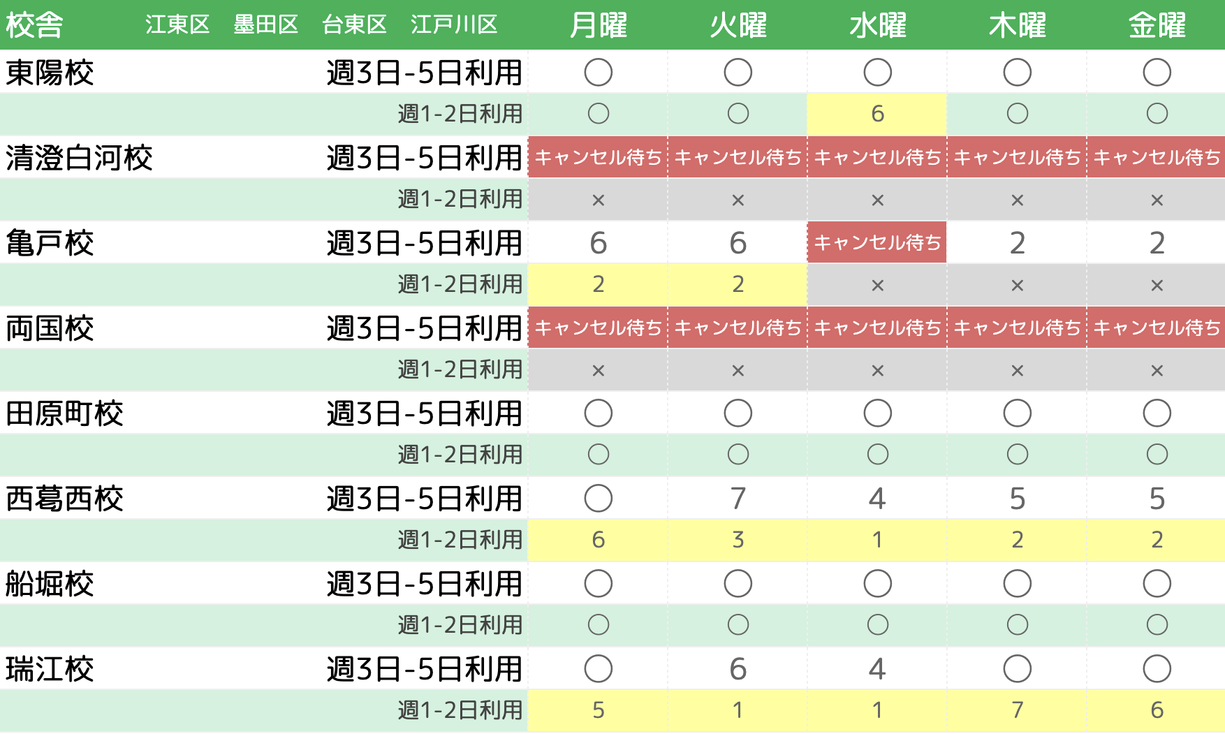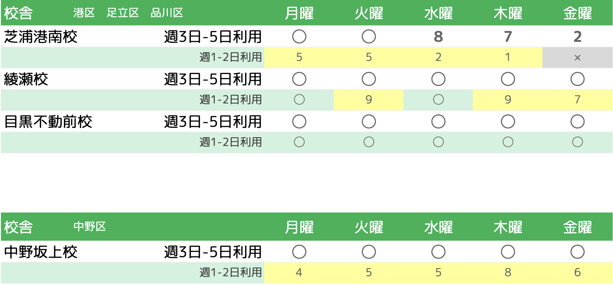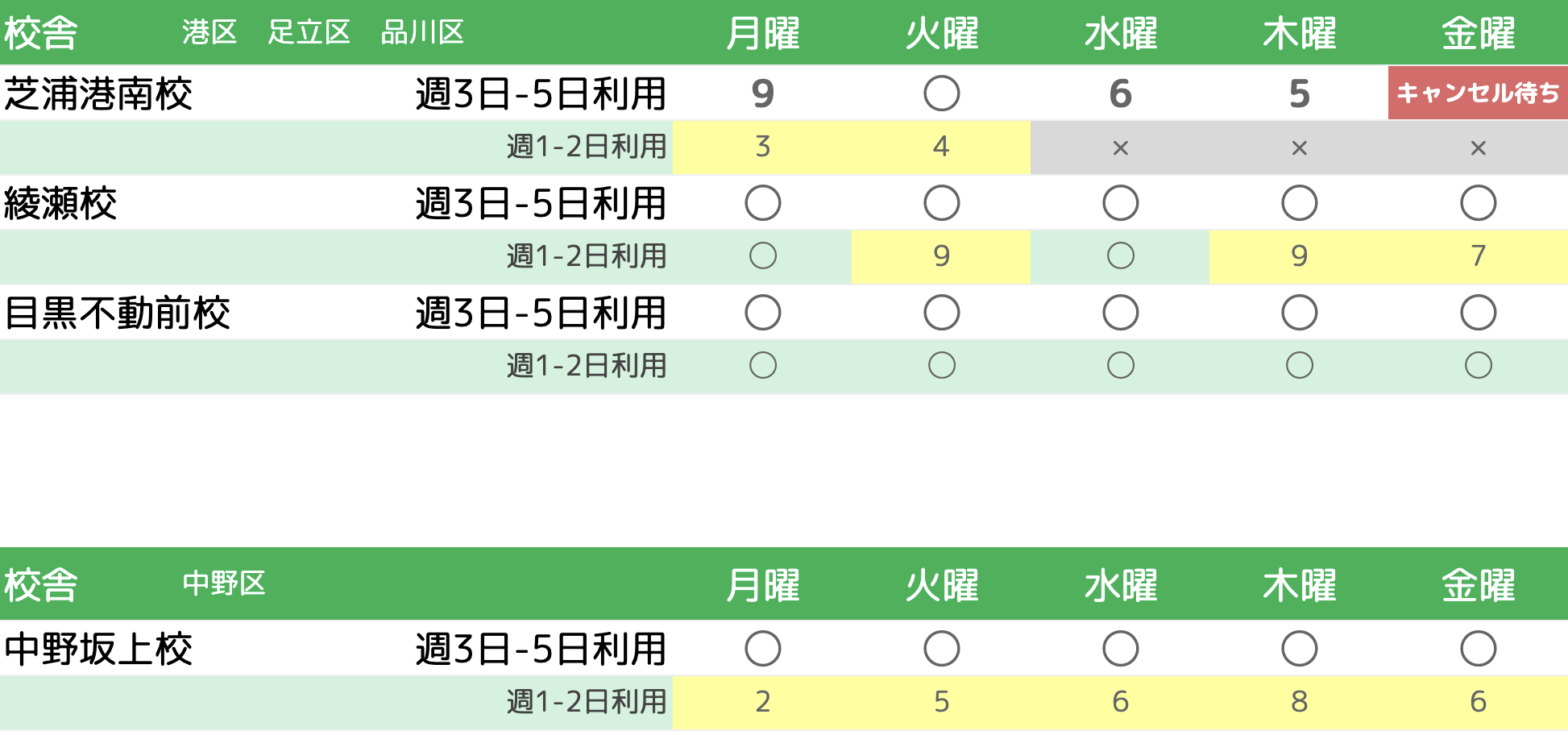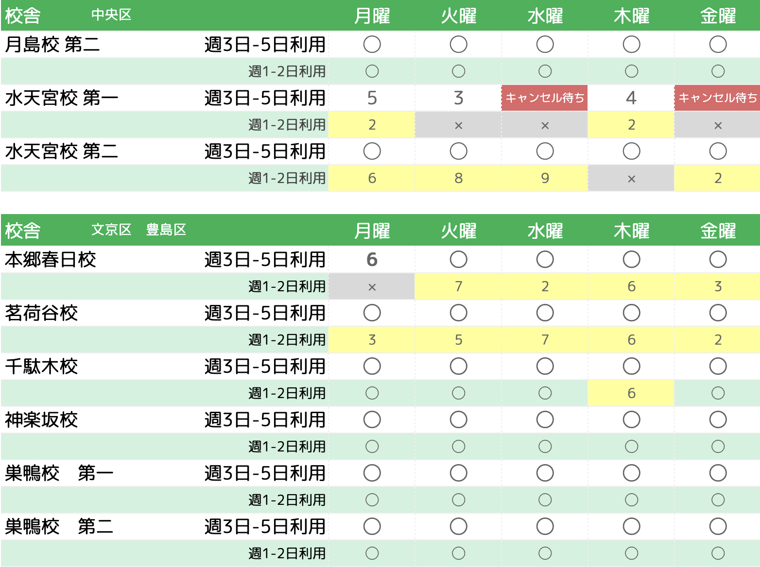 学童は保育園と異なり、小学校1年から6年までの6年間、利用し続けるとは限りません。進学塾や習い事等の理由で毎月、利用状況が少しずつ変化します。リックキッズでは過去の実績を踏まえ予約枠を設定しています。