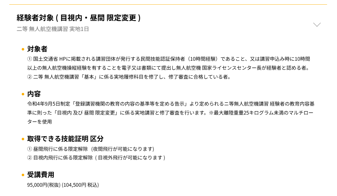 操縦ライセンス制度の種類操縦ライセンスには、これまで原則飛行禁止としてきた"第三者上空の(目視外)飛行" を可能とする「一等無人航空機操縦士(以下:一等資格)」と、"第三者上空の飛行"はできないものの、これまで飛行許可・承認が必要だった飛行空域や飛行法が手続き不要で可能になる「二等無人航空機操縦士(以下:二等資格)」の二種類があります。取得は16歳以上、有効期限は3年間です。