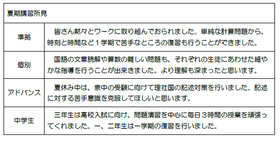 夏期講習では、1学期の復習をすることで大切な基礎を固めることができ、また苦手分野の再確認ができたと感じています。