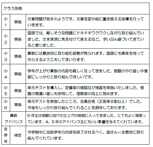 月の半ばでは個人面談もございます。ご家庭でのお子様のご様子や学習状況などを教えていただき、今後の指導の参考にさせていただきますので、どうぞよろしくお願いいたします。
