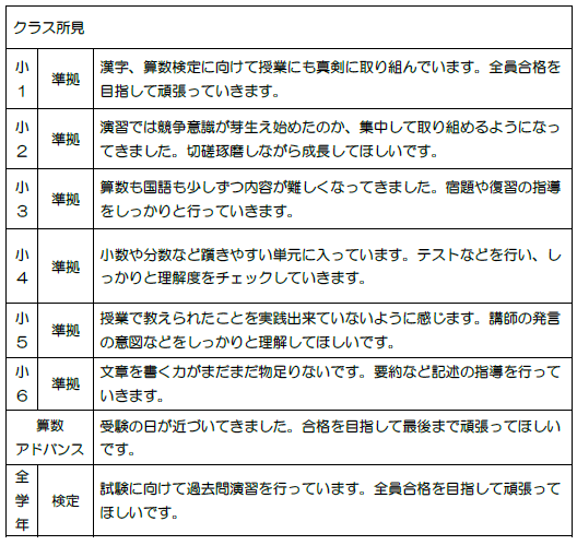 | 小2準拠 | 新年度がはじまり、少し浮ついた空気があり、集中力に欠けるときがありますが、宿題に対する取り組みなどはとても意欲的です。 |