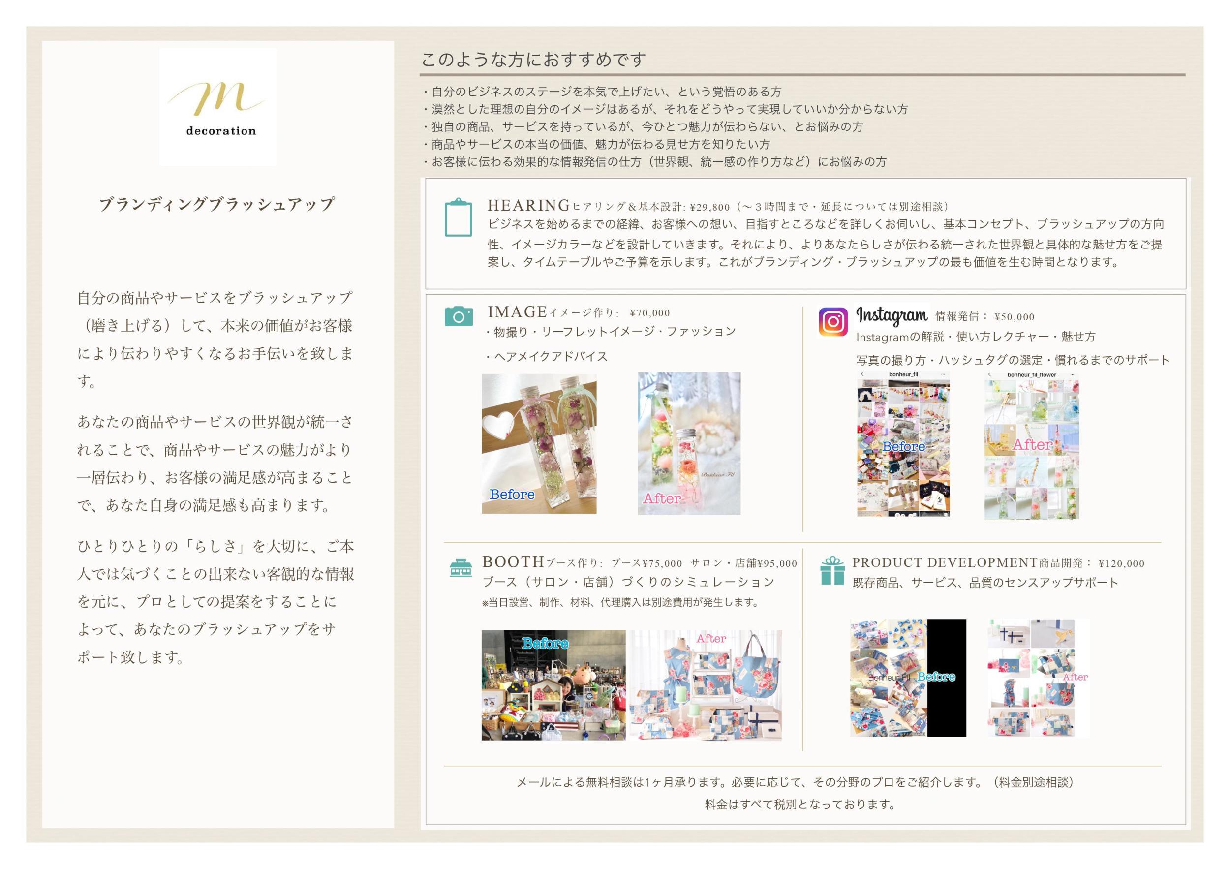 その他、個人事業主、企業向けに、ブランドイメージの向上を実現する『ブランディングブラッシュアップ』という独自サービスを展開中。