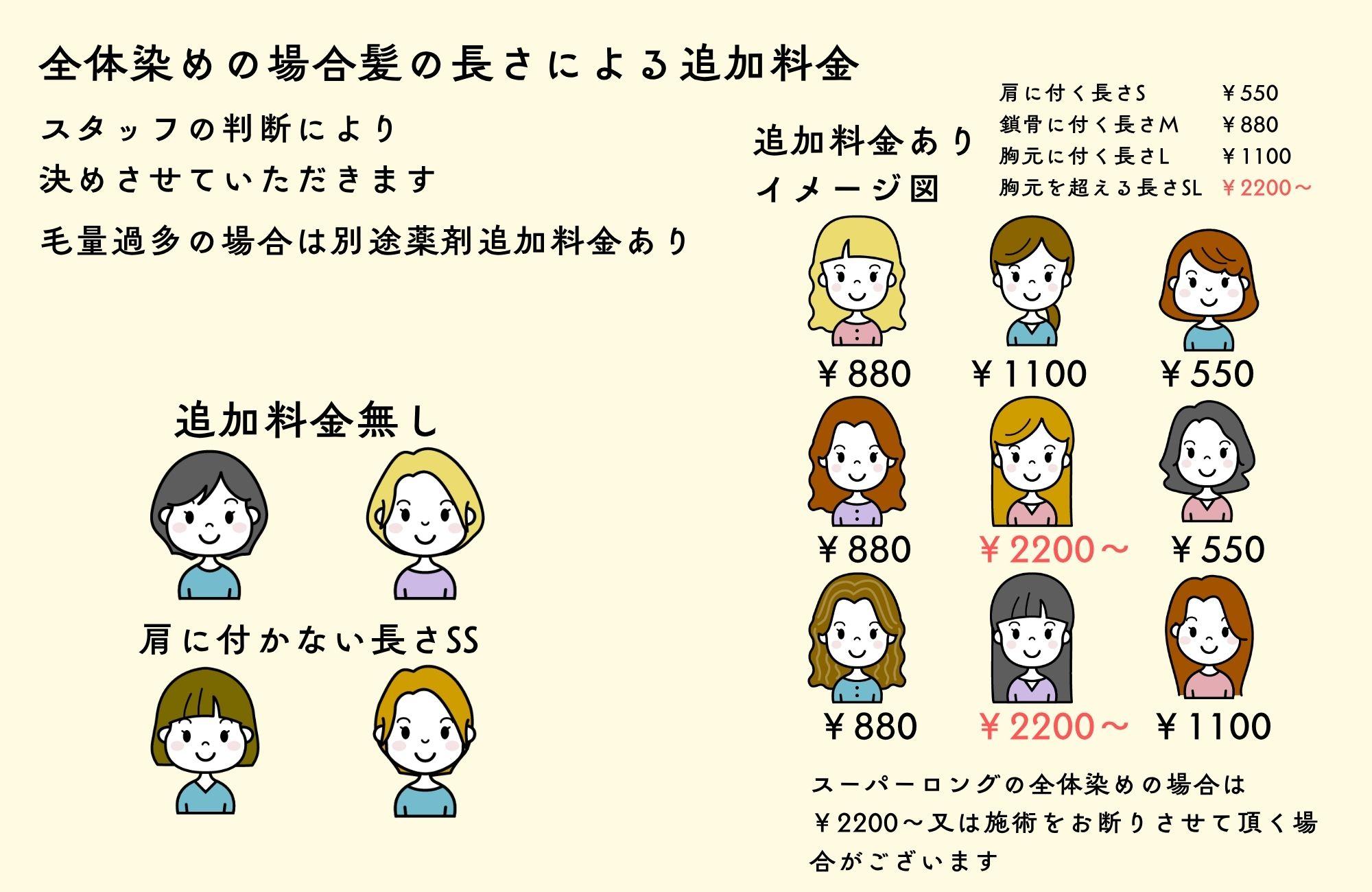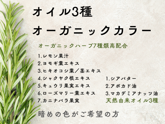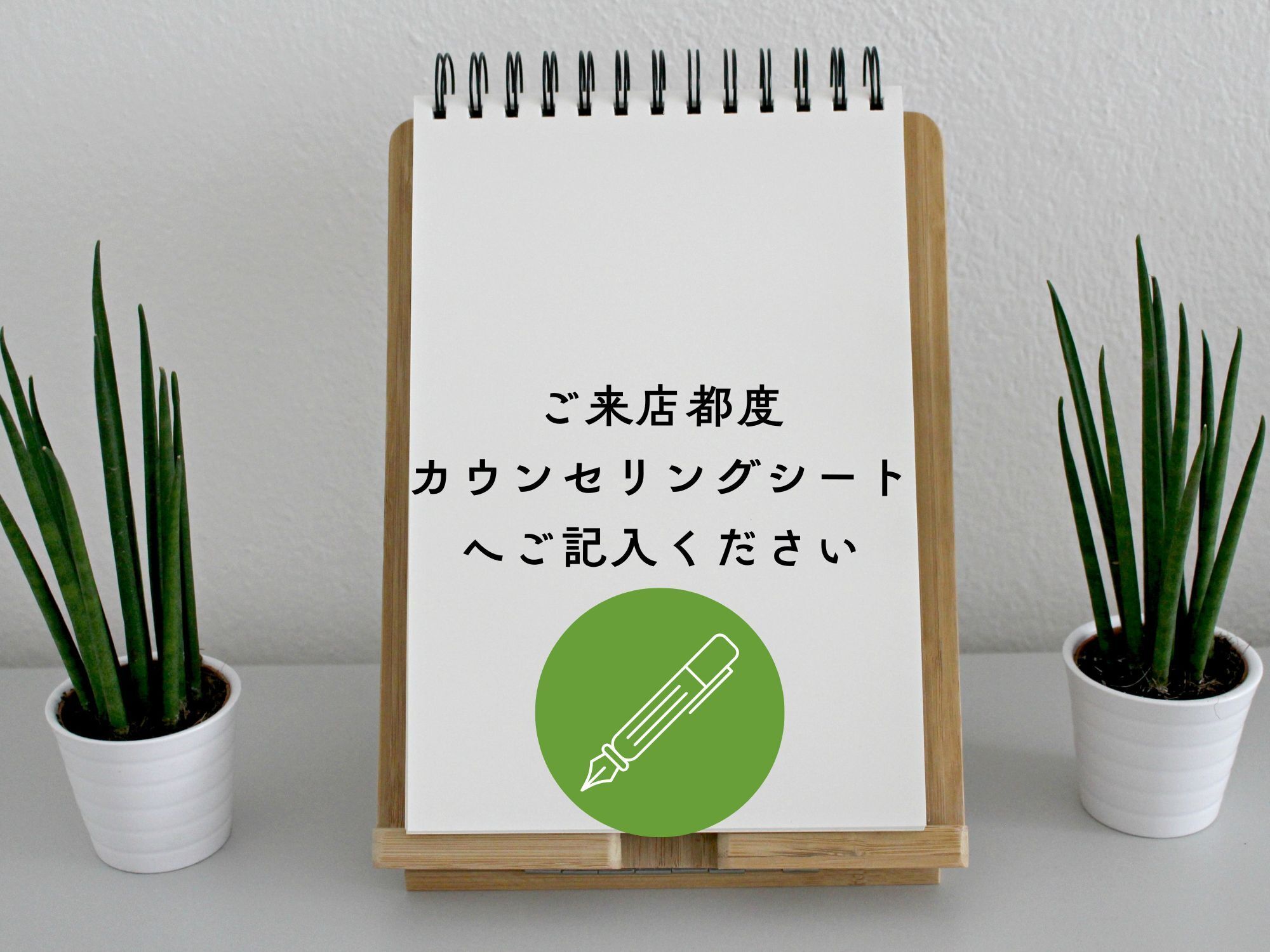 髪に何も付いて無い状態でご来店スタイリング剤/オイル/白髪隠しなど付いている場合はスタッフに必ずお伝え下さい白髪染めに影響があります、プレシャンプー(¥550)が必要な場合がございます。服装はフード付きや襟が大きい洋服白系統の洋服は控えて下さい、施術中に違和感などありましたらすぐにお知らせください |