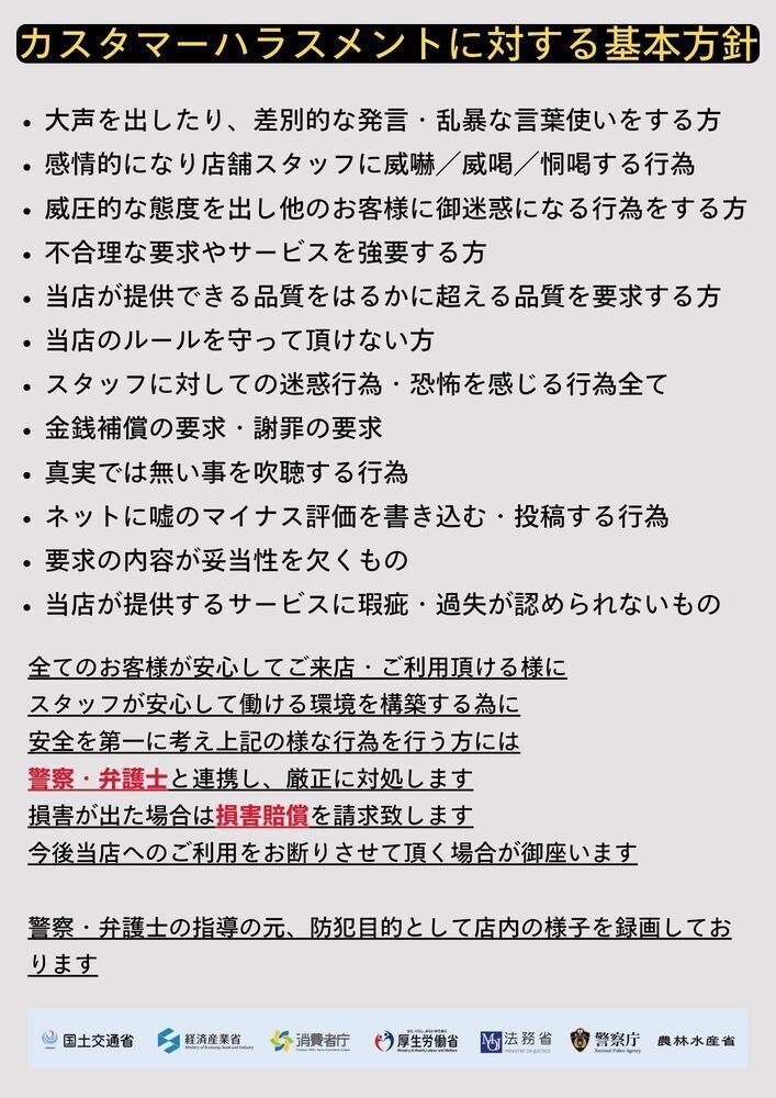 ※男性・女性問わずカスタマーハラスメントに該当する方はお断りしております
