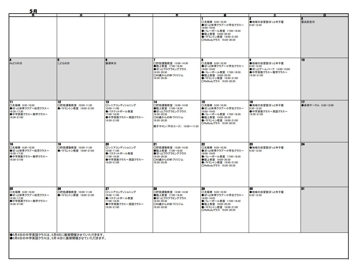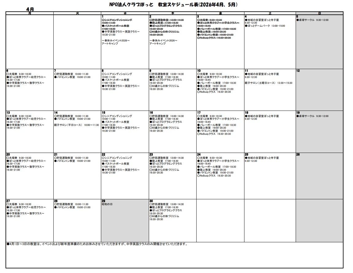 定期教室のスケジュール表2026年4月、5月分を更新しました!詳細はこちら |