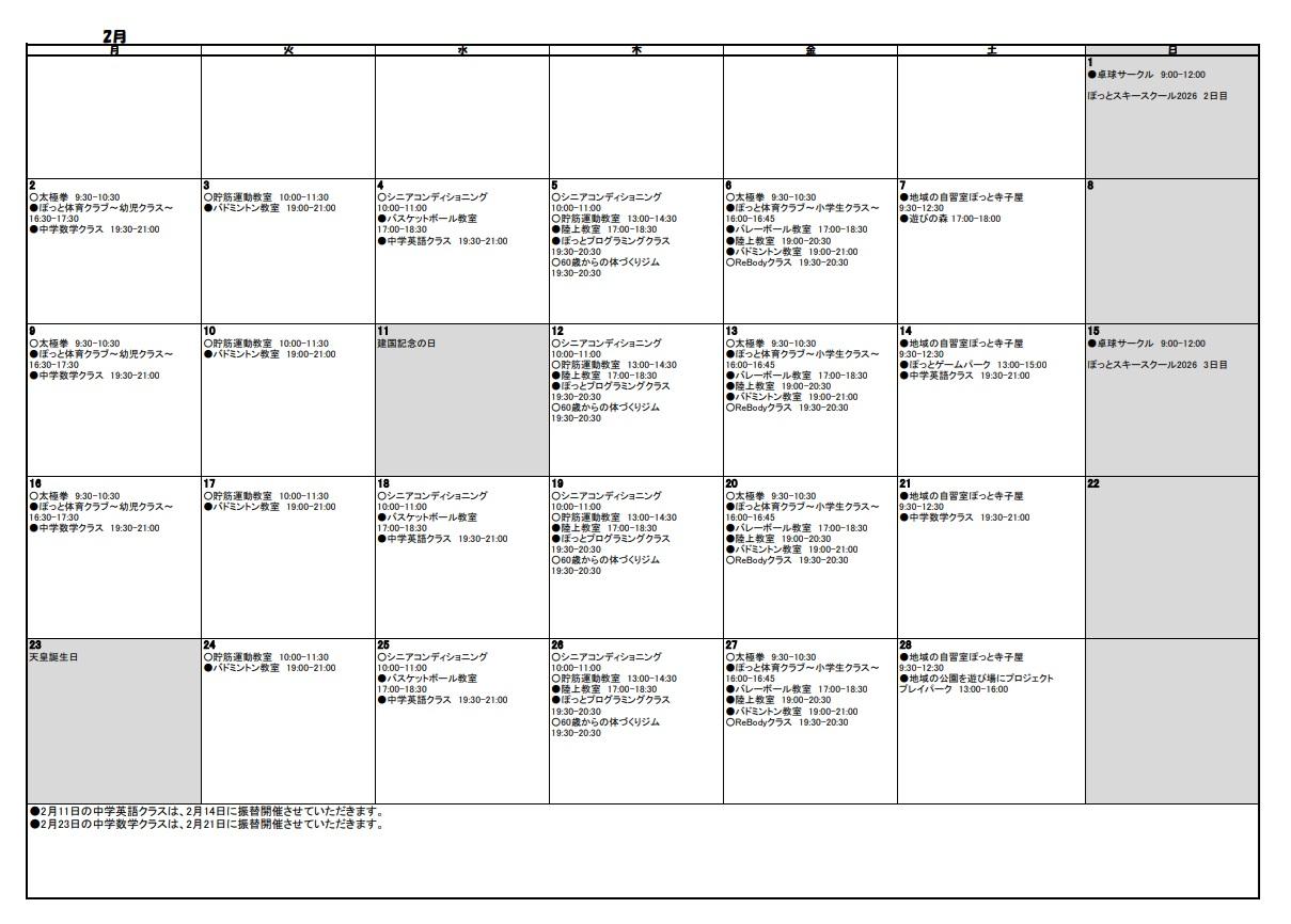 定期教室のスケジュール表2026年1月、2月分を更新しました!詳細はこちら |