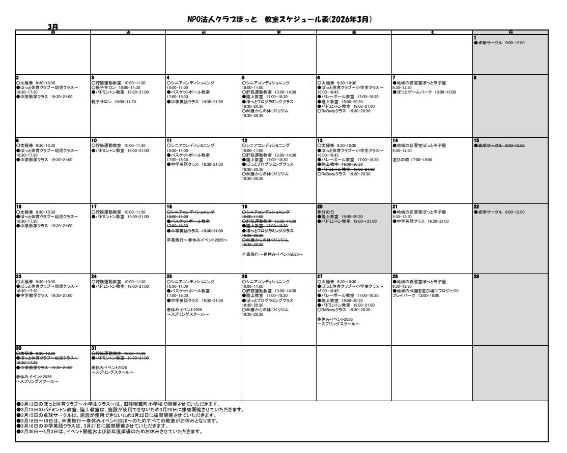 定期教室のスケジュール表2026年3月分を更新しました!詳細はこちら |