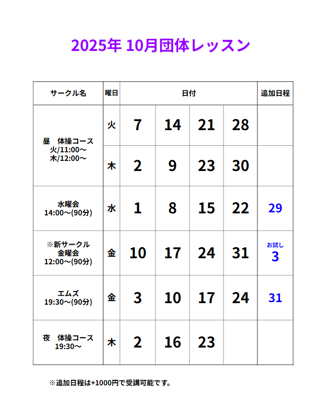 | 各種団体レッスン(60分〜90分) | 月4,200円 〜5,200円 |