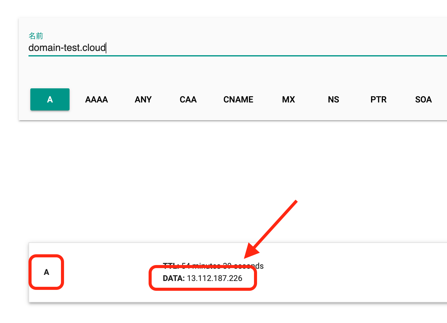 「DATA」にペライチのIPアドレス「13.112.187.226」が「1つだけ」表示されていれば、ネームサーバー(DNSサーバー)にAレコードが正しく設定されています。