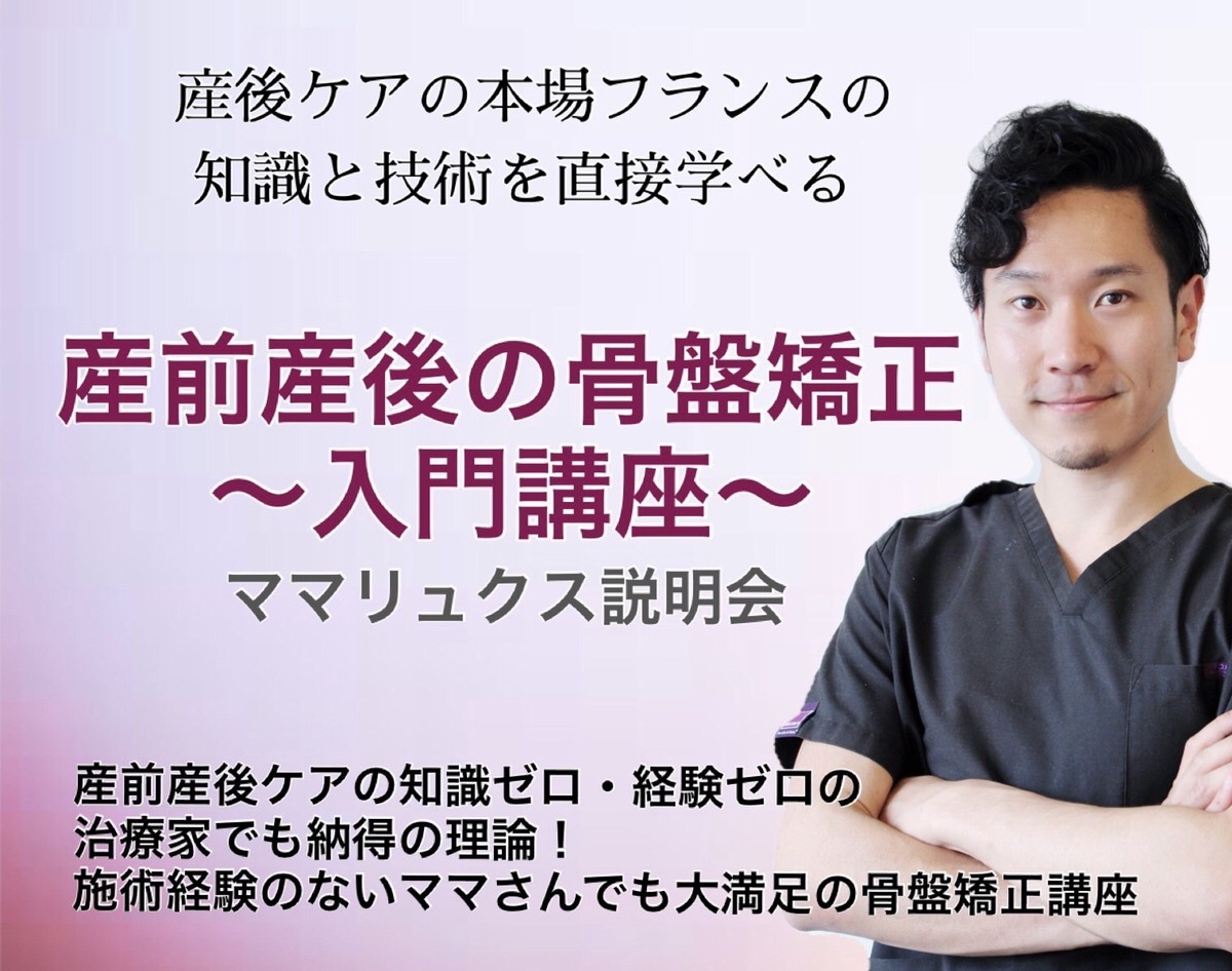 ママリュクスの骨盤矯正~入門講座~では、約3時間の中で、産後の骨盤矯正について学べるのはもちろんのこと、産前産後に起こりやすい、腰痛、恥骨痛など、産前産後ケアを行う上で必ず知っておくべき内容について、実際の臨床経験をもとにお伝えします。