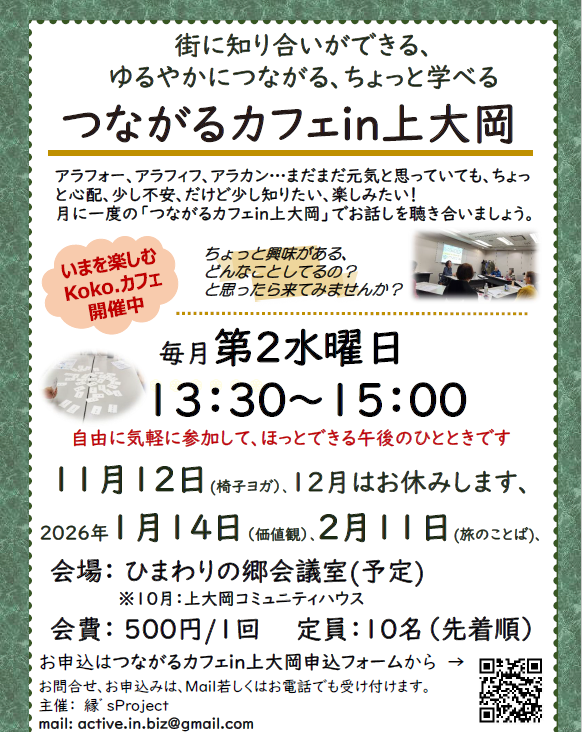 追伸、12月のつながるカフェin上大岡は、お休みさせていただきます。11月の次は1月14日となります。