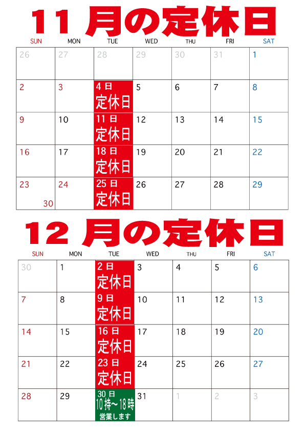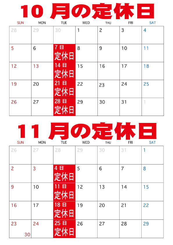 10月の定休日・・10/7(火)、10/14(火)、10/21(火)、10/28(火) 11月の定休日・・11/4(火)、11/11(火)、11/18(火)、11/25(火) |