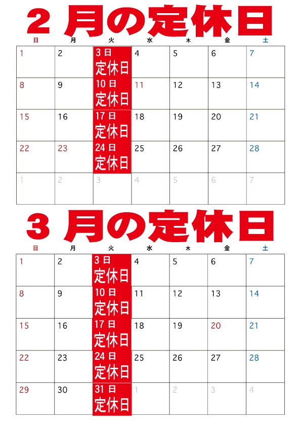 2月の定休日・・2/3(火)、2/10(火)、2/17(火)、2/24(火) 3月の定休日・・3/3(火)、3/10(火)、3/17(火)、3/24(火)、3/31(火) |