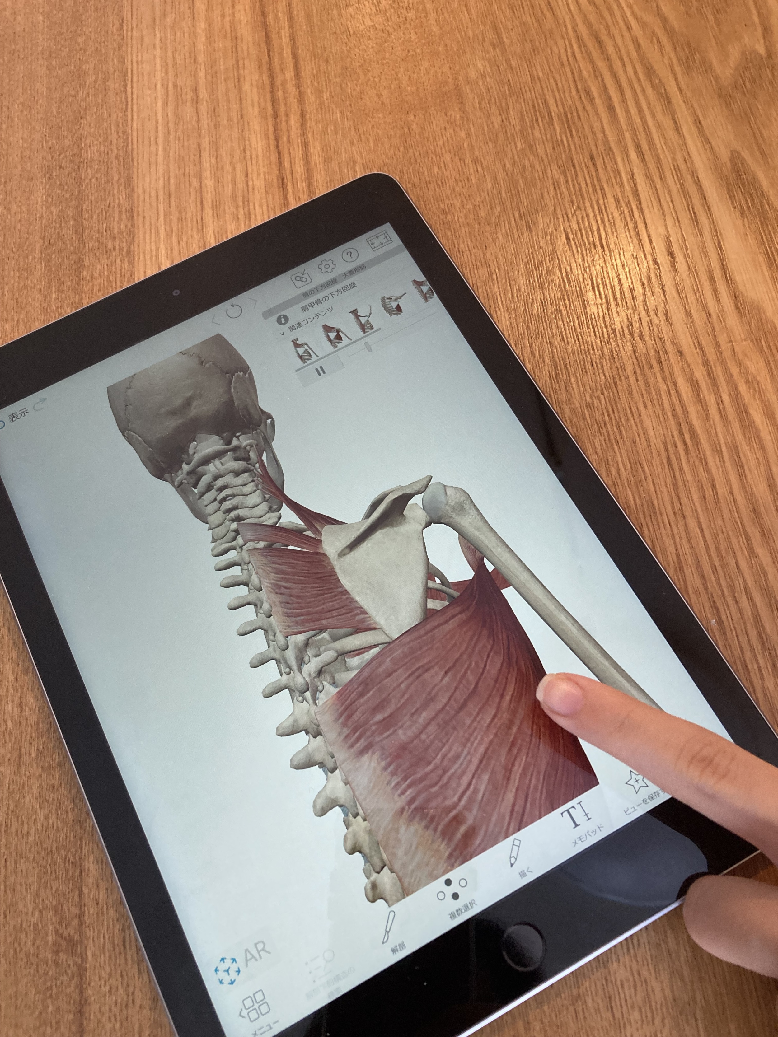 もし筋肉が動いている様子が見れたらその存在は現実になります。医学生も利用しているアプリ等で筋肉の部位や動きの立体的に見て確認してご自身の身体を動かしてみます。
