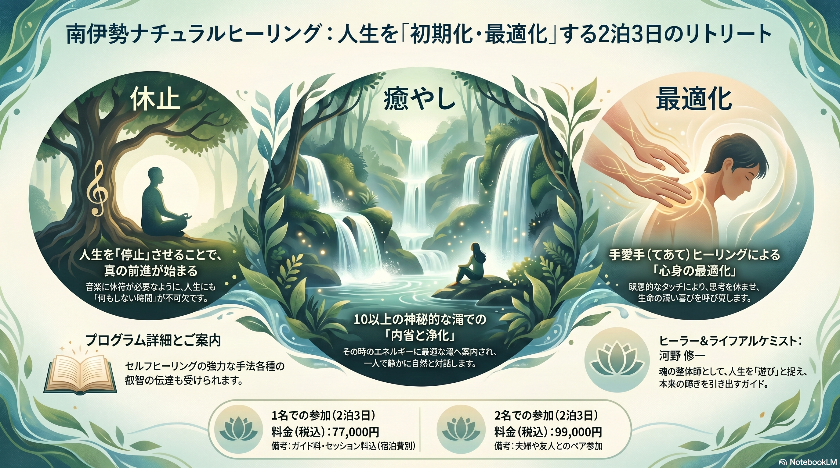 1日目 ランチをご一緒しながら軽くカウンセリング 1〜2箇所の滝を訪問 1回目の手愛手のヒーリングセッション 2日目 タッチ瞑想の伝達 ランチ 1〜2箇所の滝、入江を訪問 3日目 健康と自己実現に関するトークセッション ランチ 1〜2箇所の滝、入江を訪問 |