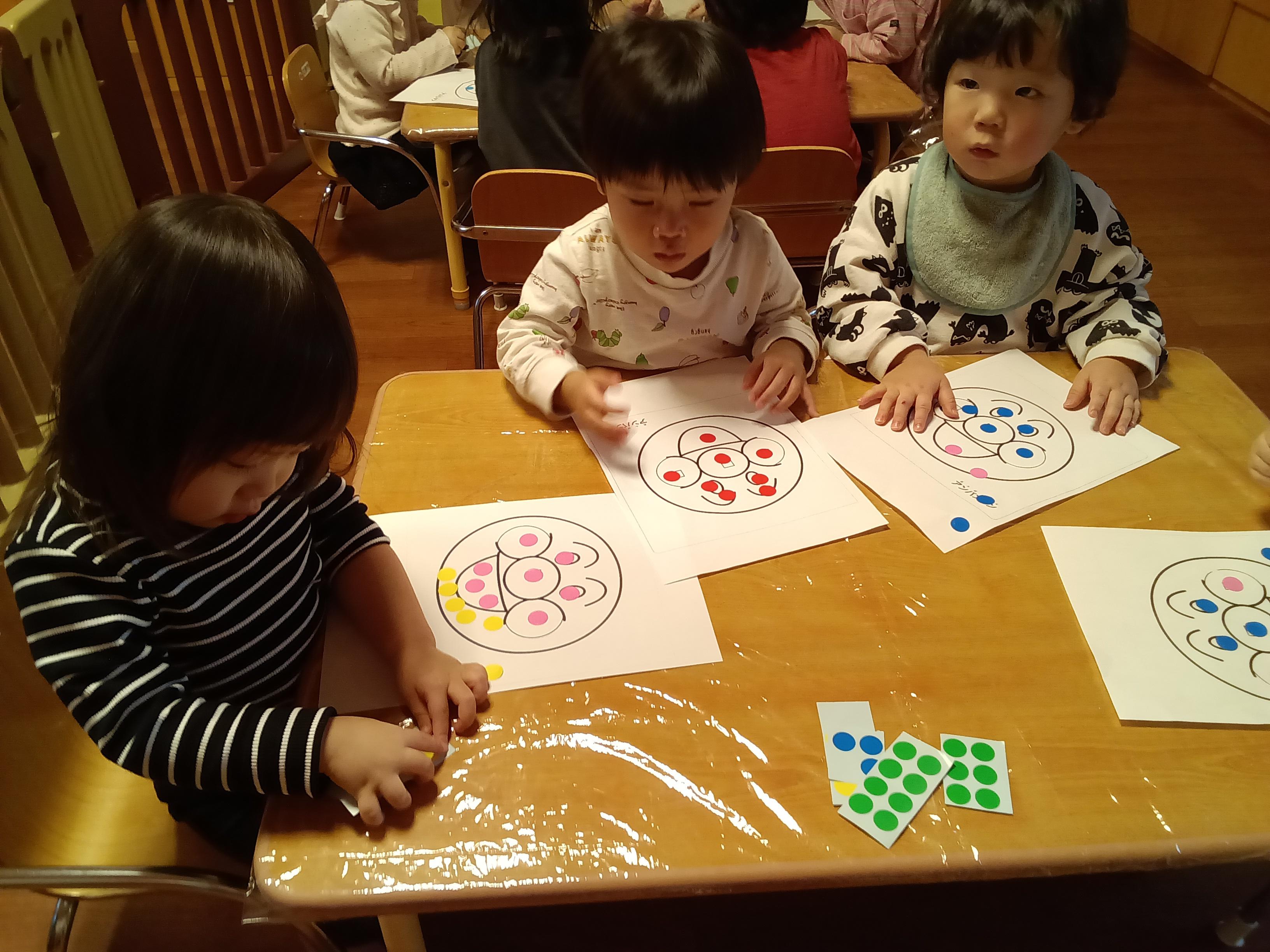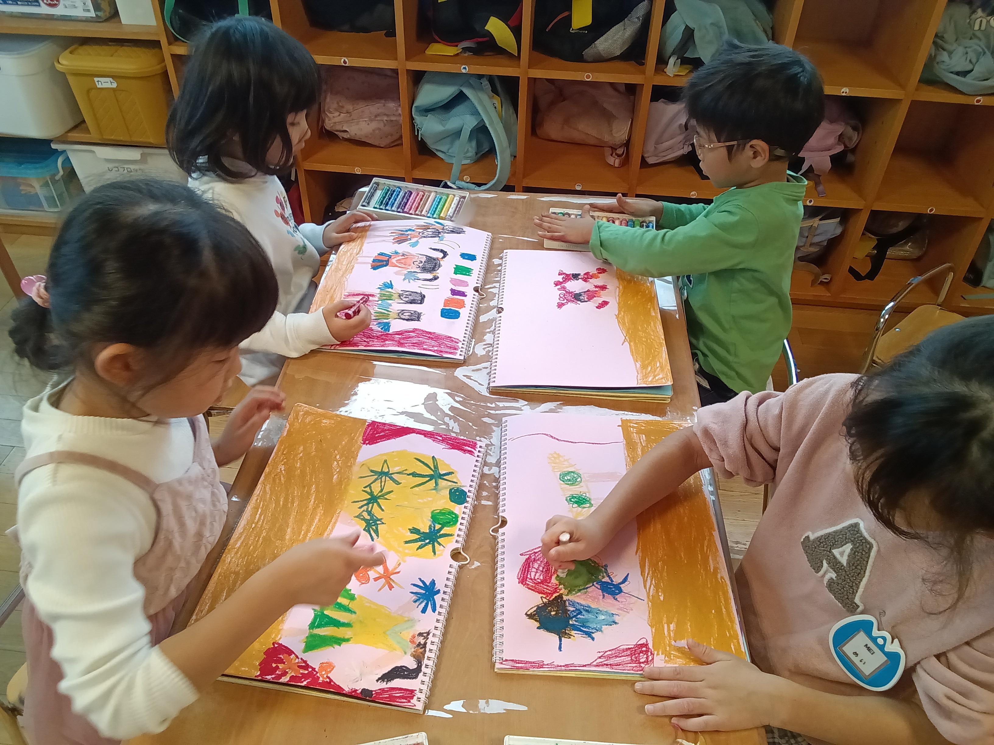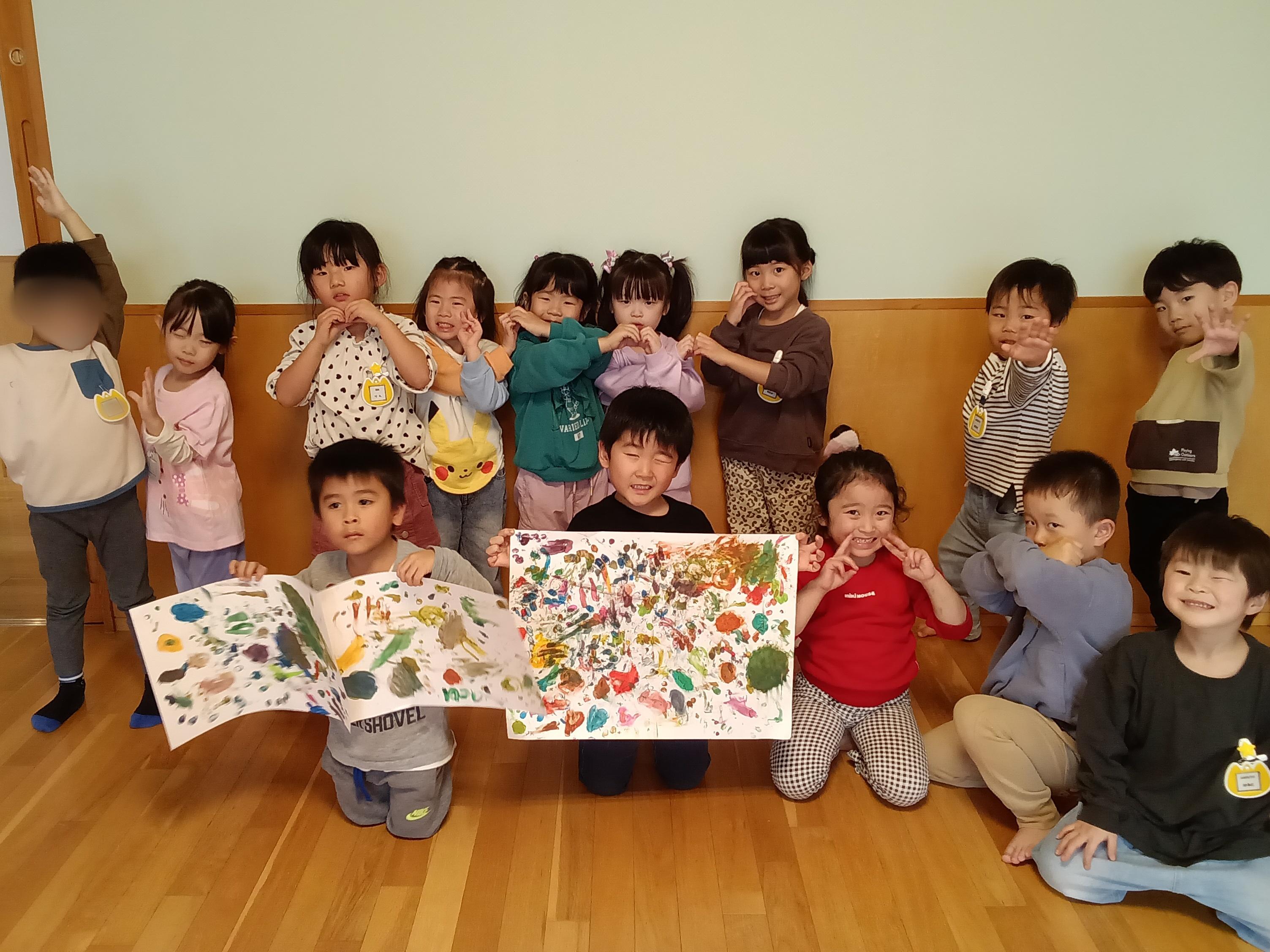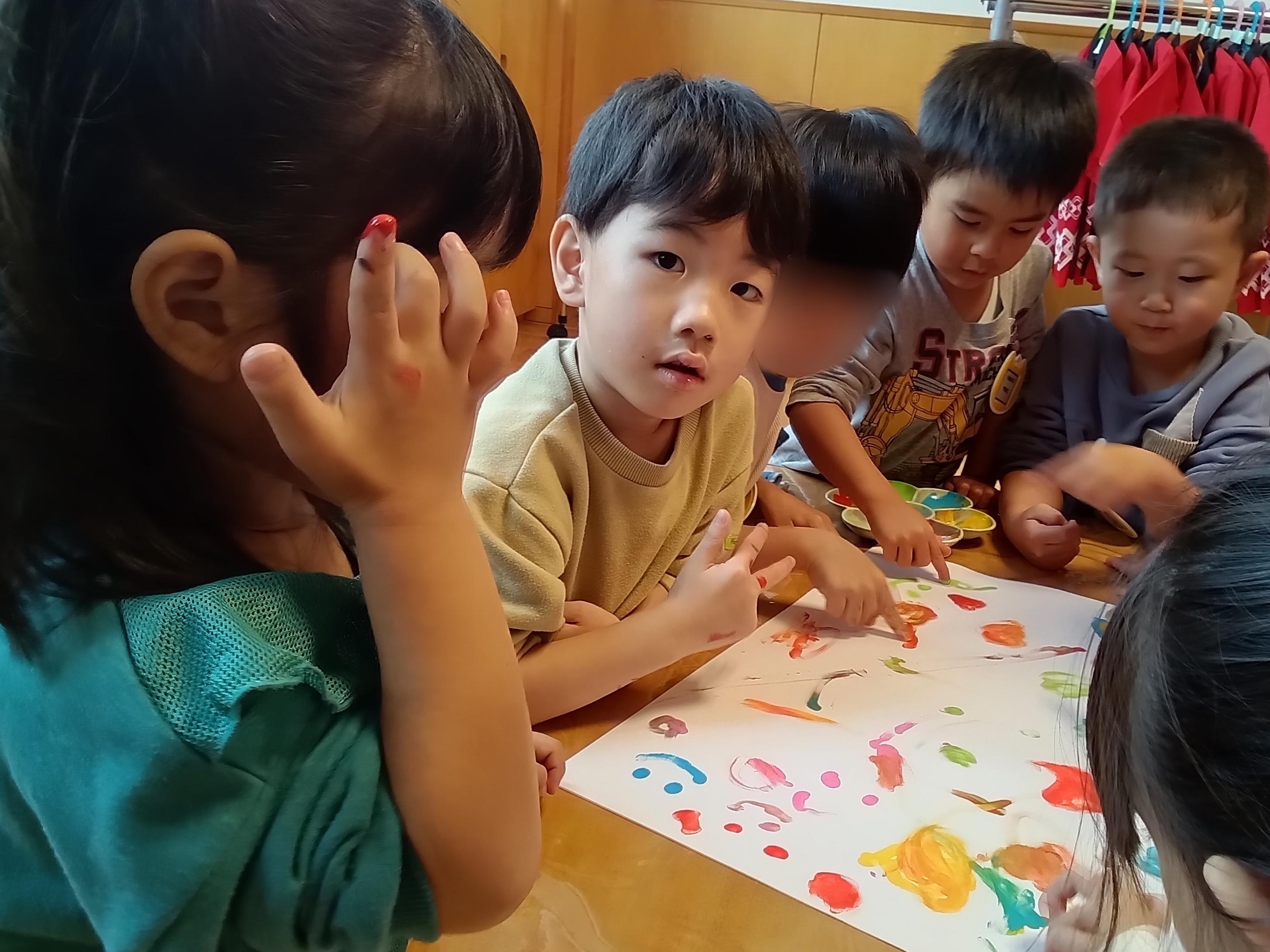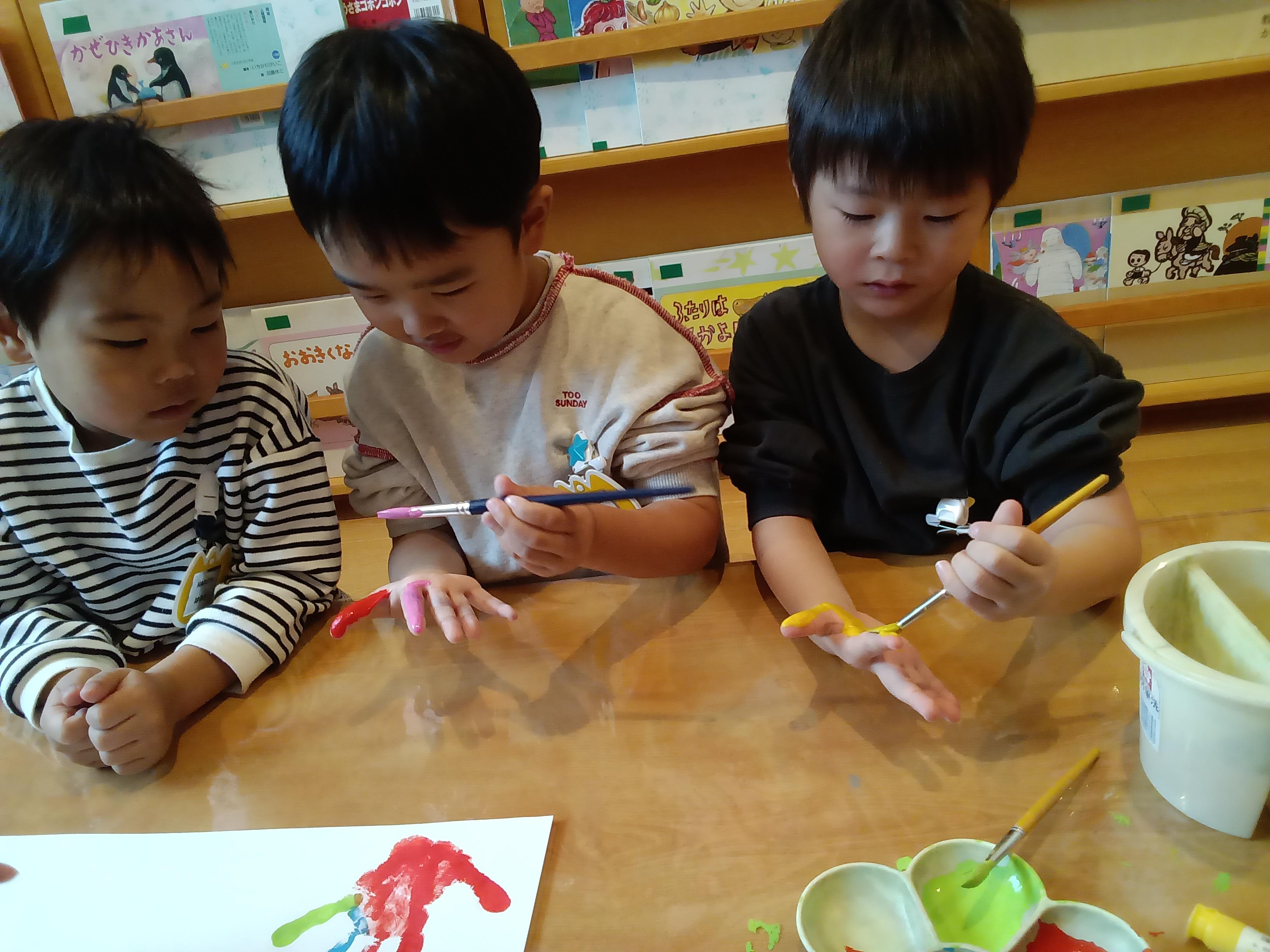 11月6日(水) 勤労感謝の日の制作の様子です🌼好きな色を選び手形スタンプをした後は、絵の具をもっとやりたい!というリクエストで急遽大きな画用紙に指スタンプで絵を描きました🌈ホールで「いろはにこんぺいとう」をして体も動かしました。