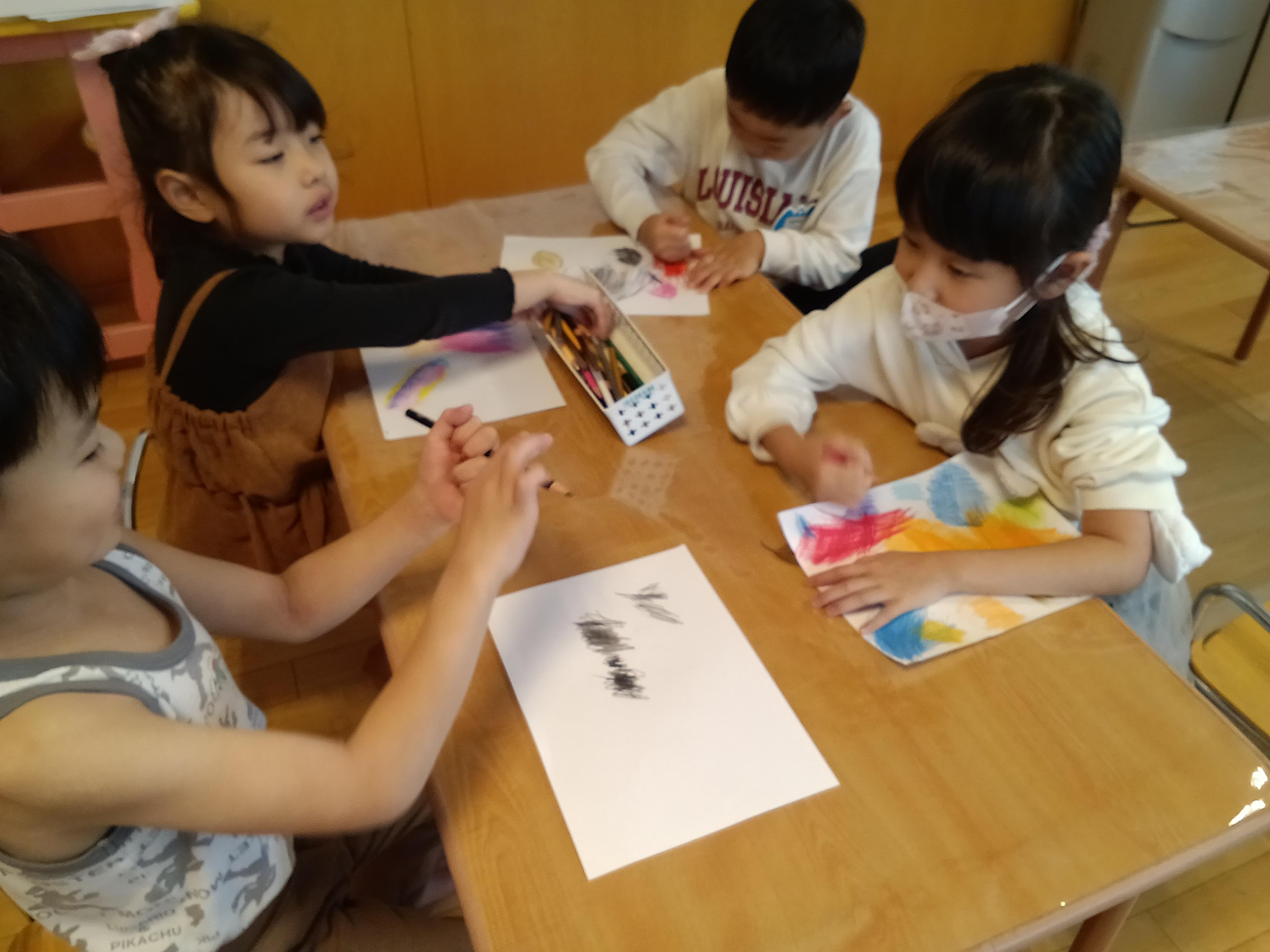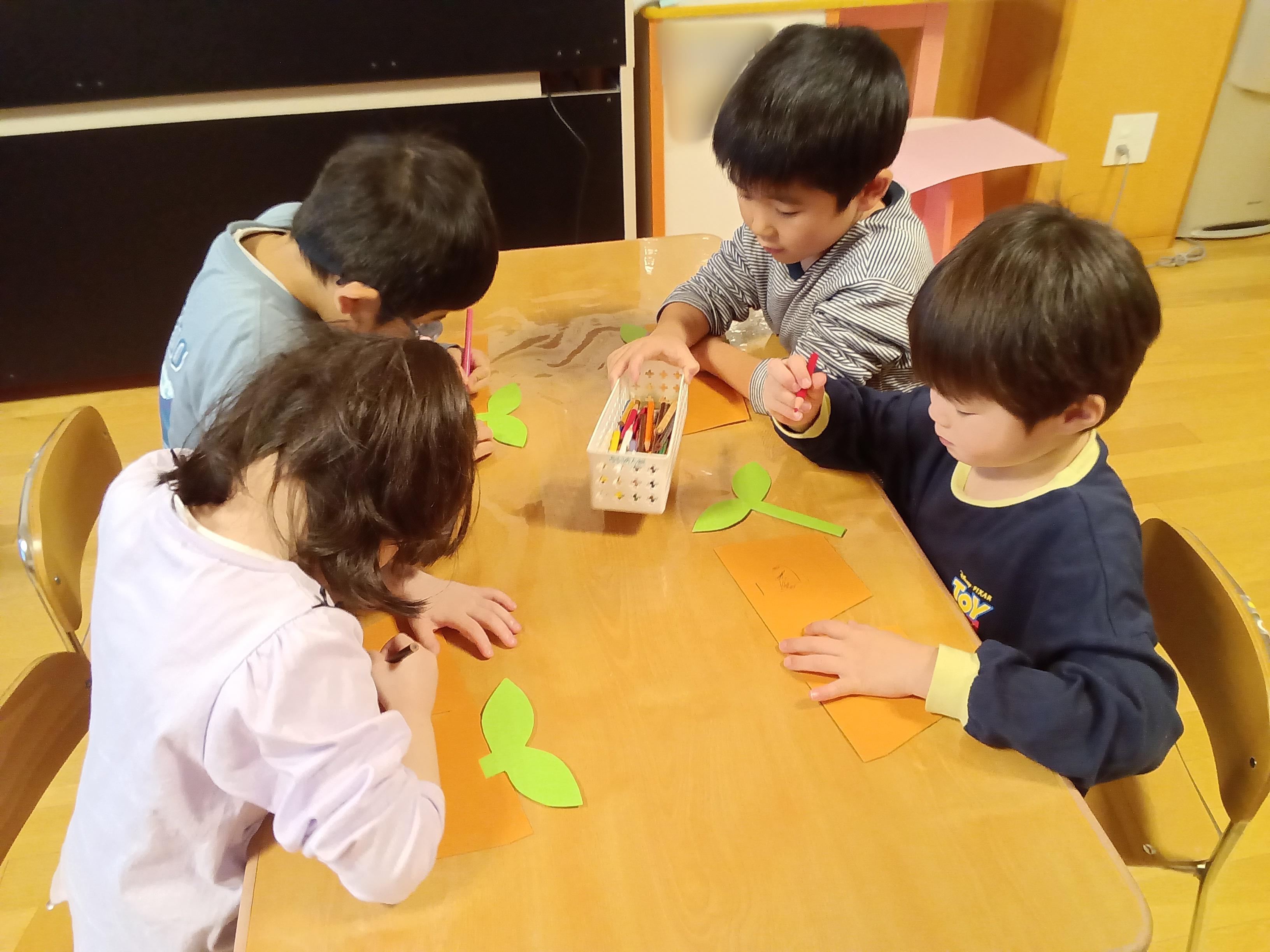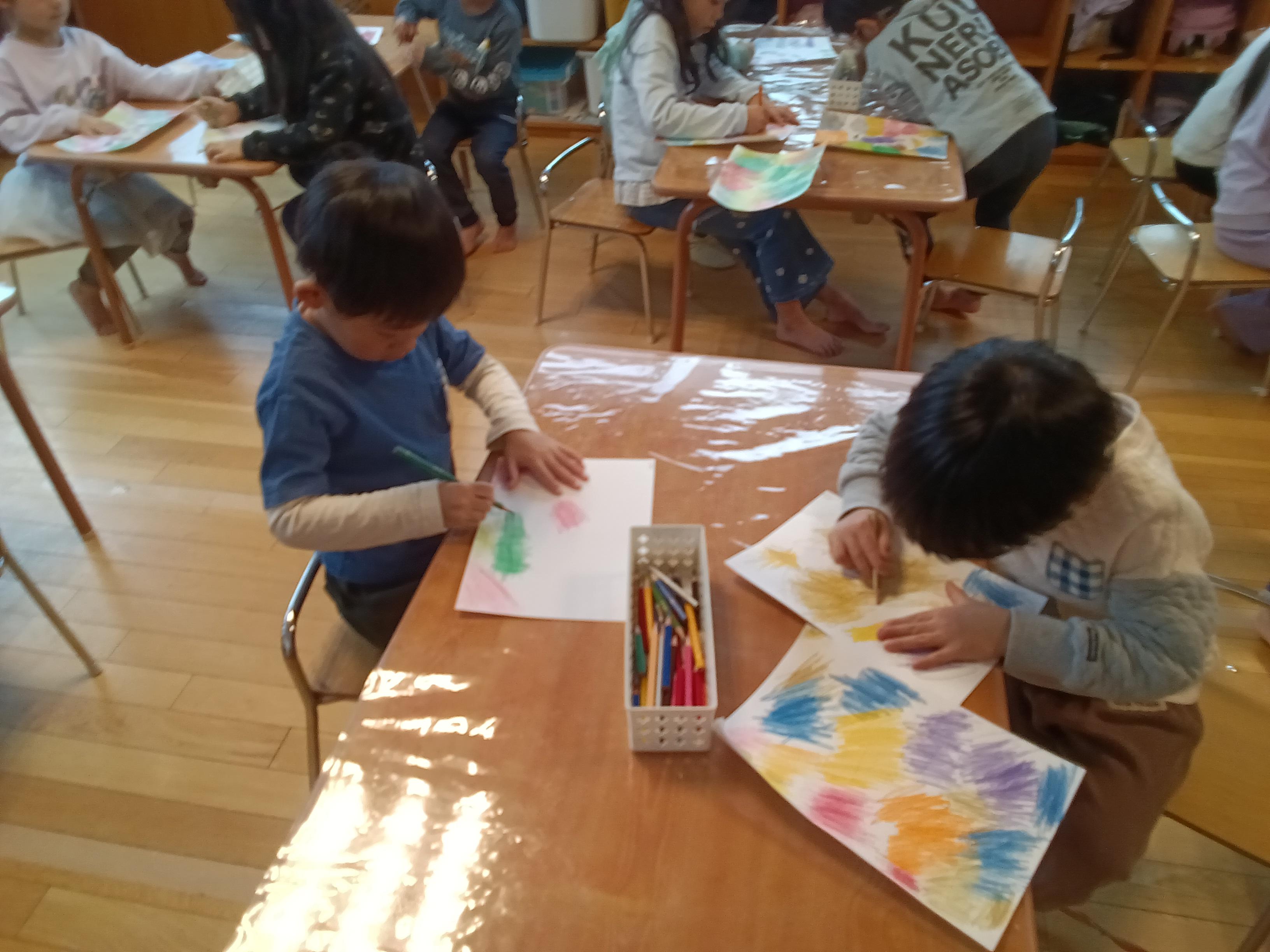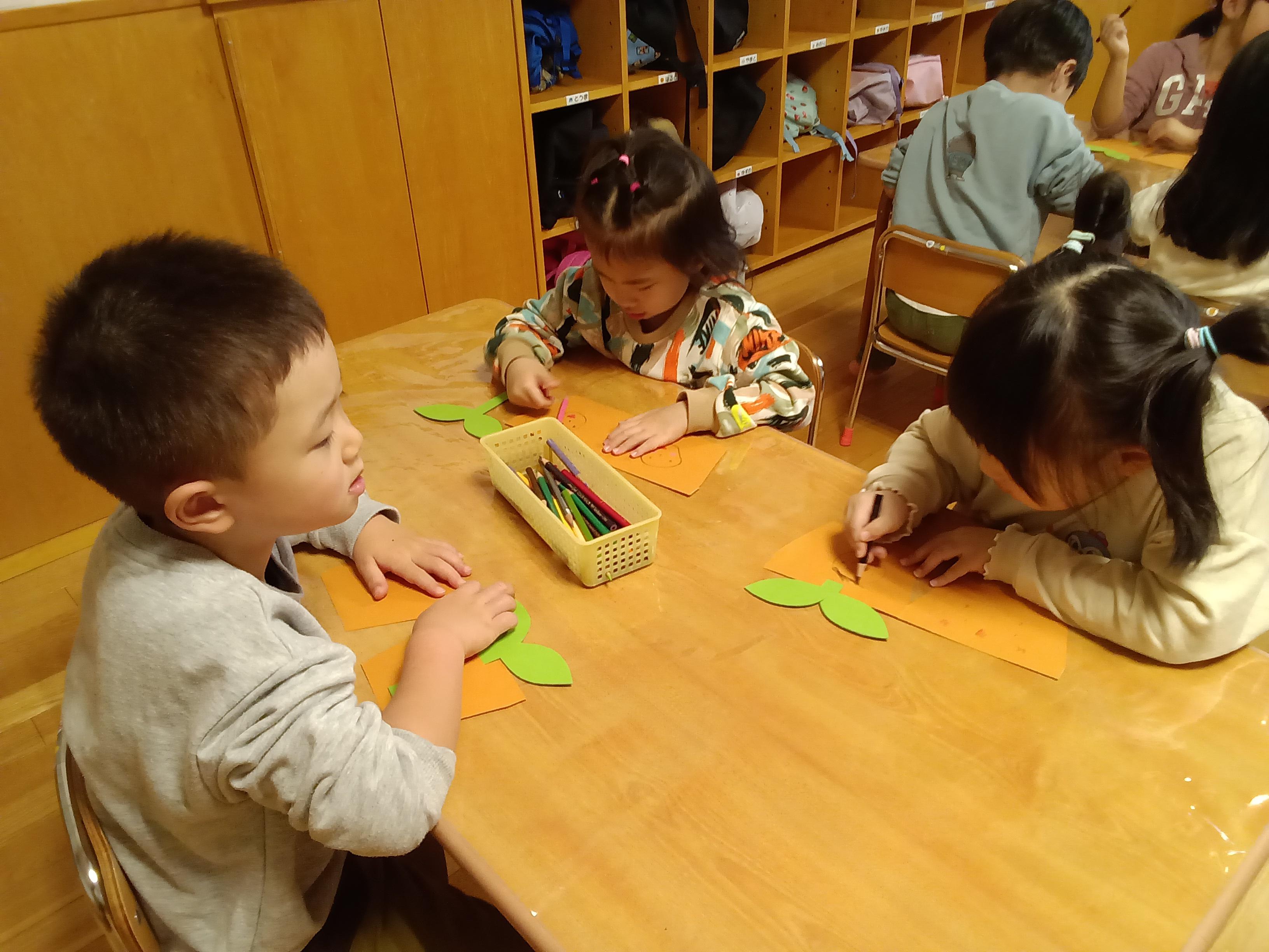 11月6日(水) 勤労感謝の日の制作の様子です🌼好きな色を選び手形スタンプをした後は、絵の具をもっとやりたい!というリクエストで急遽大きな画用紙に指スタンプで絵を描きました🌈ホールで「いろはにこんぺいとう」をして体も動かしました。
