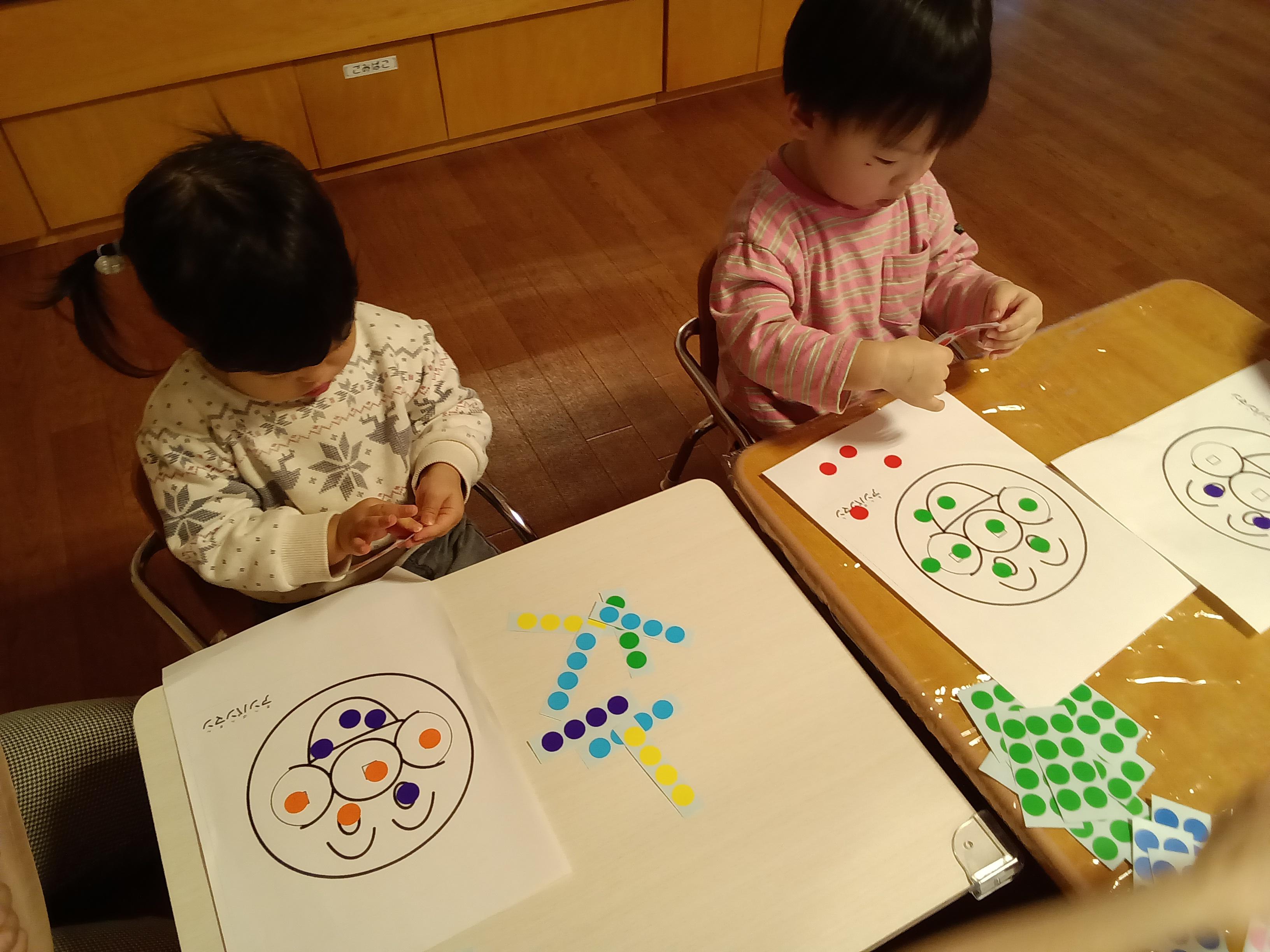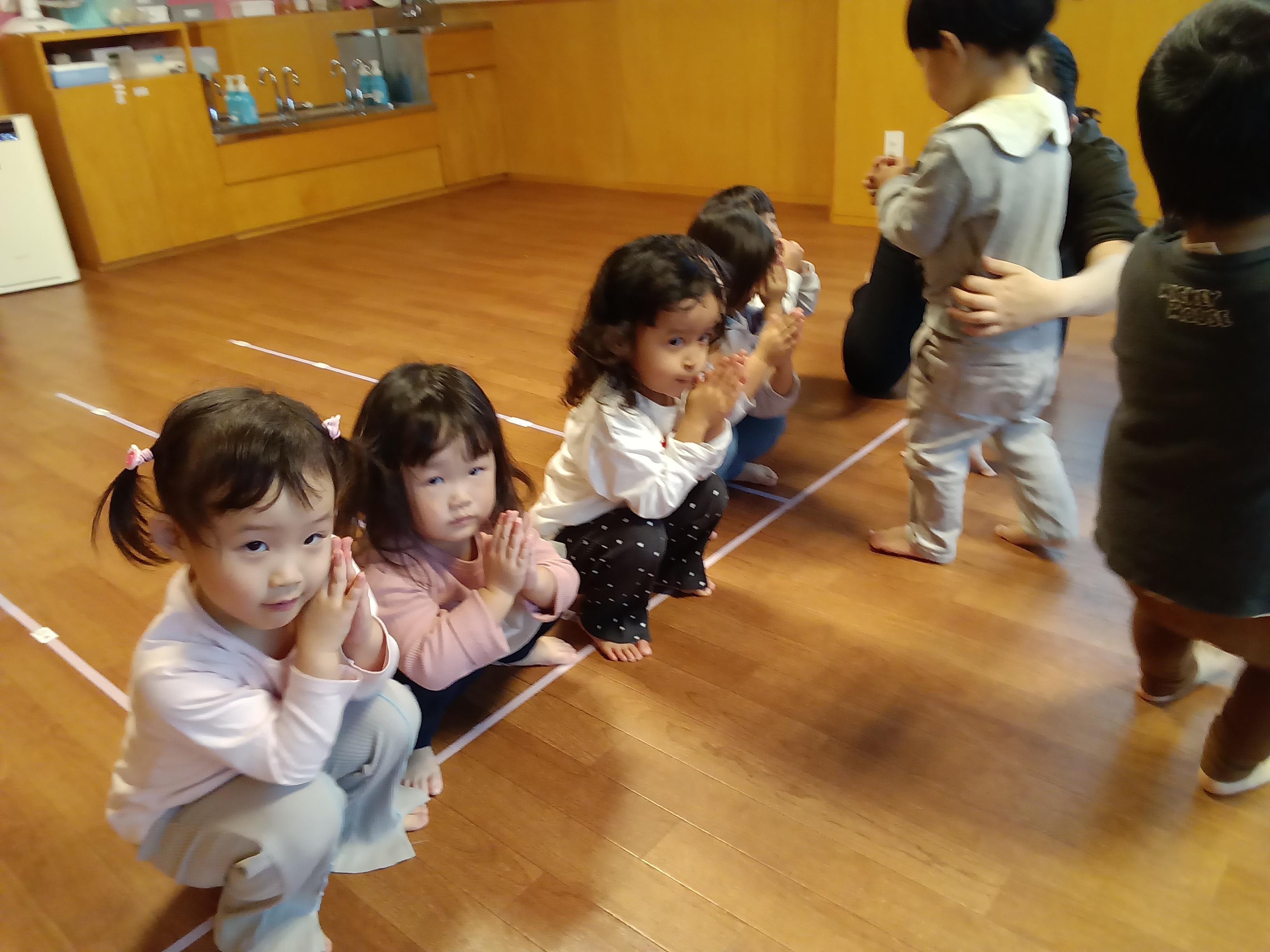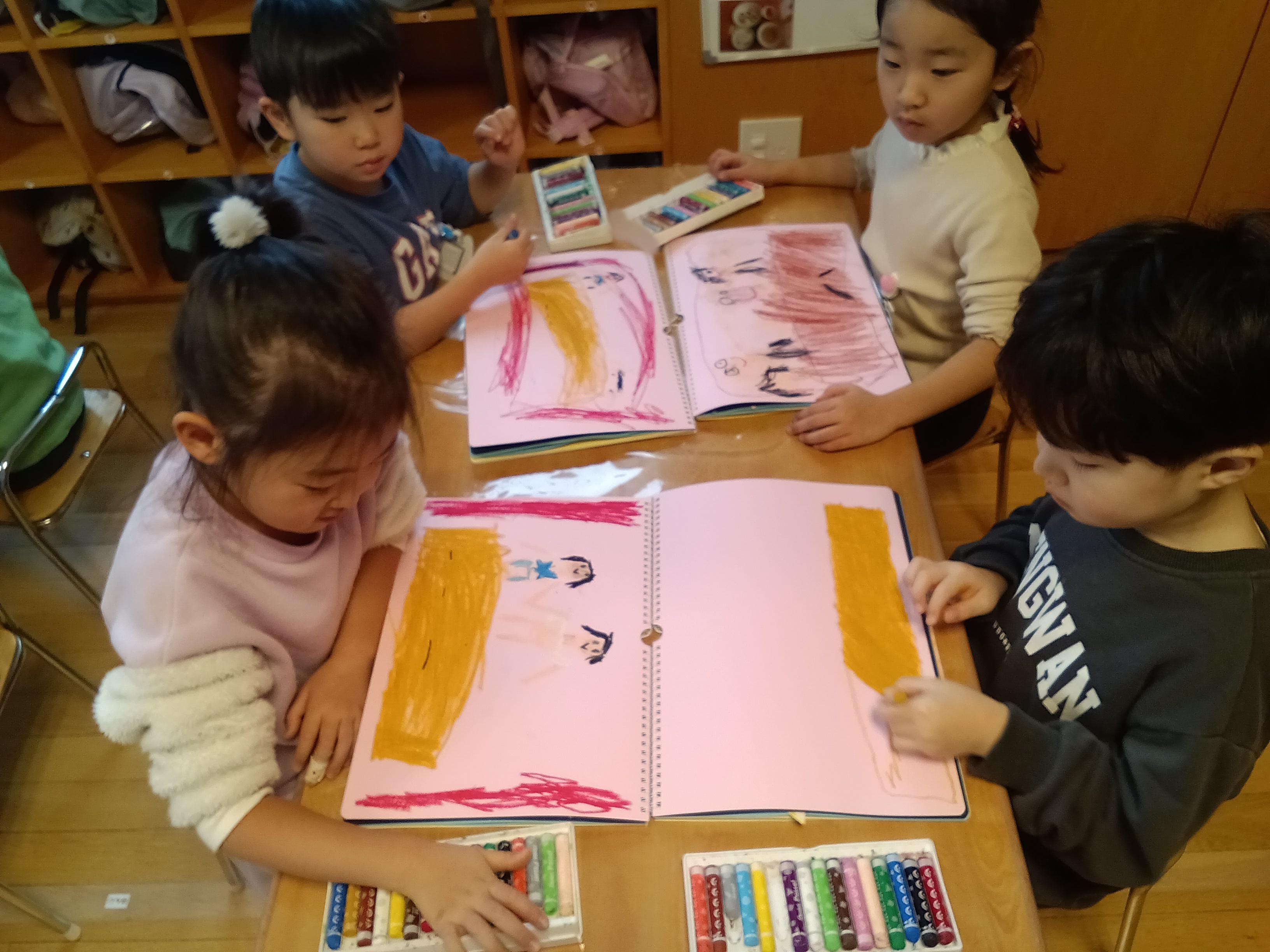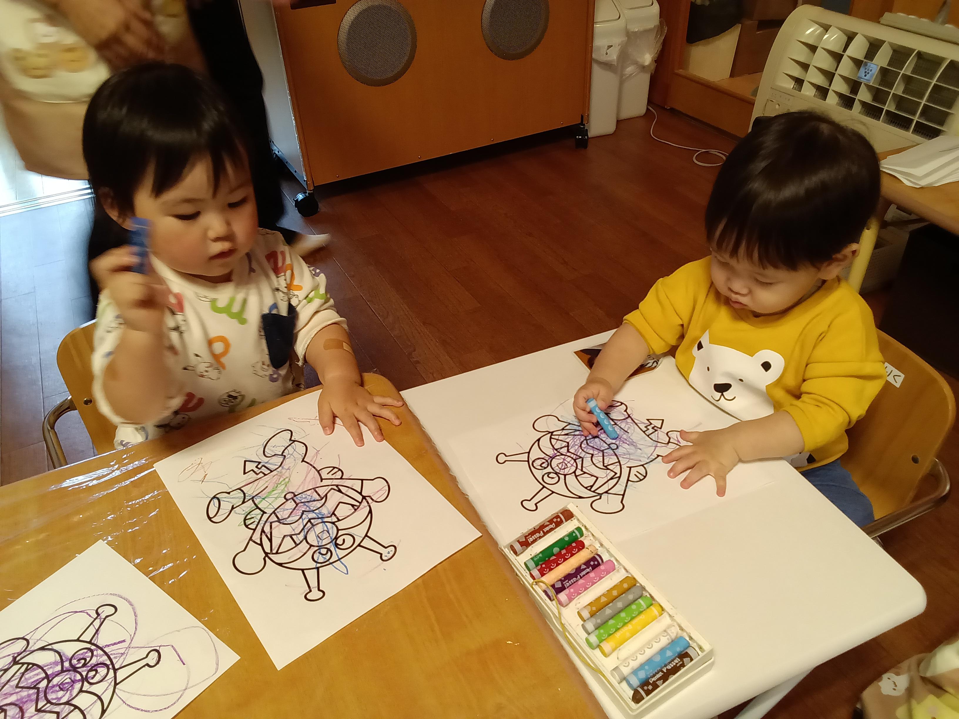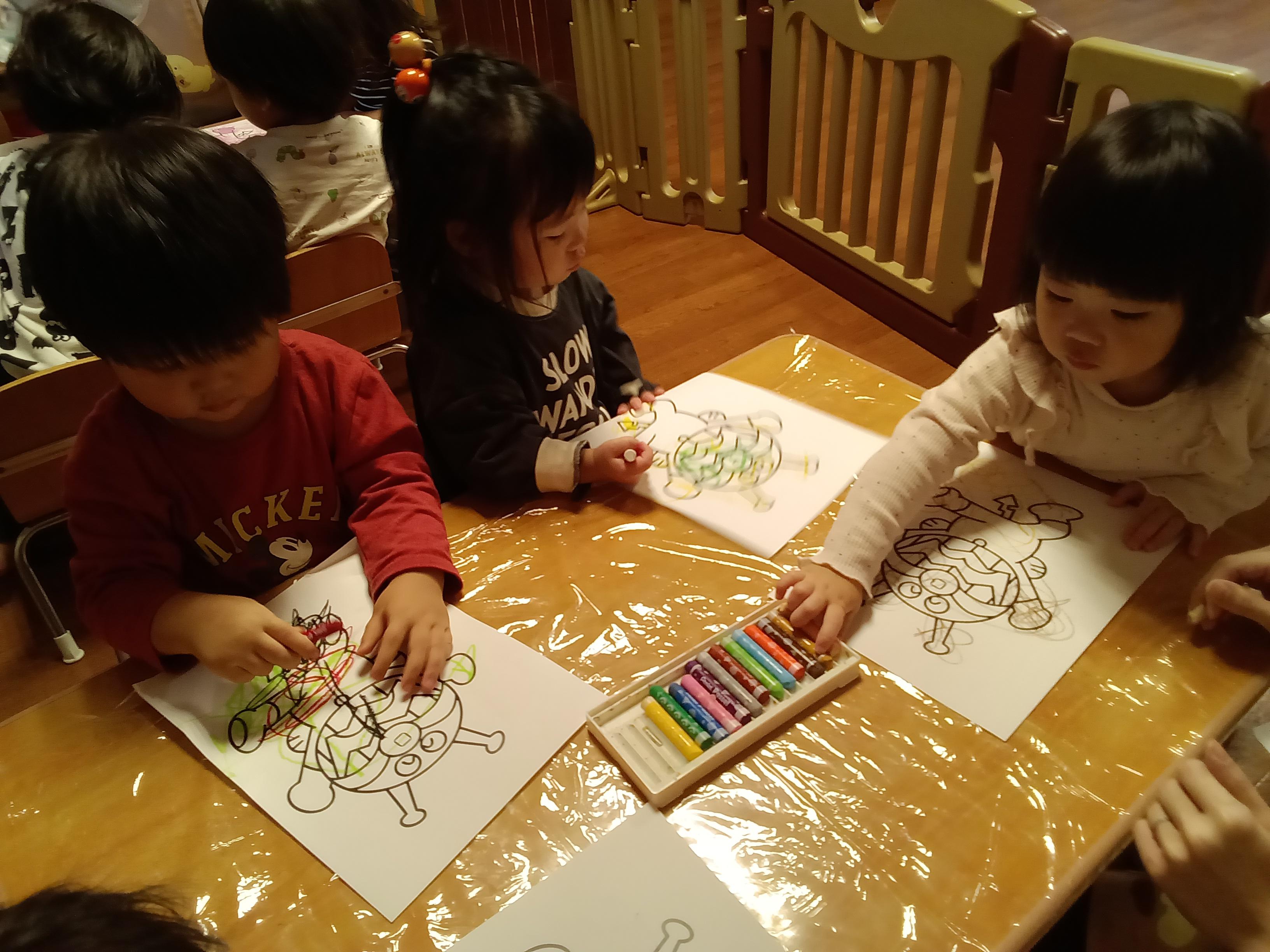 11月6日(水) 勤労感謝の日の制作の様子です🌼好きな色を選び手形スタンプをした後は、絵の具をもっとやりたい!というリクエストで急遽大きな画用紙に指スタンプで絵を描きました🌈ホールで「いろはにこんぺいとう」をして体も動かしました。