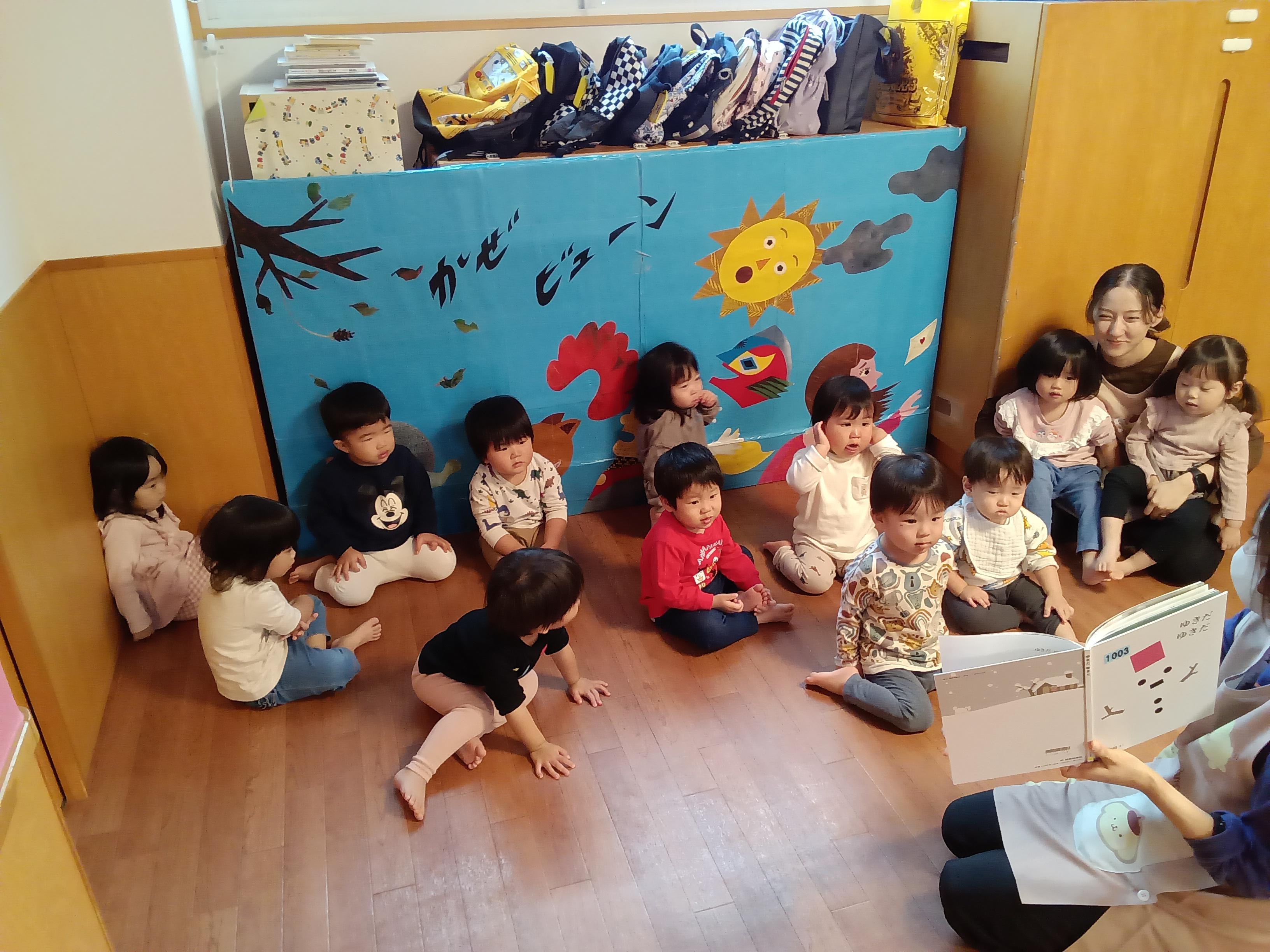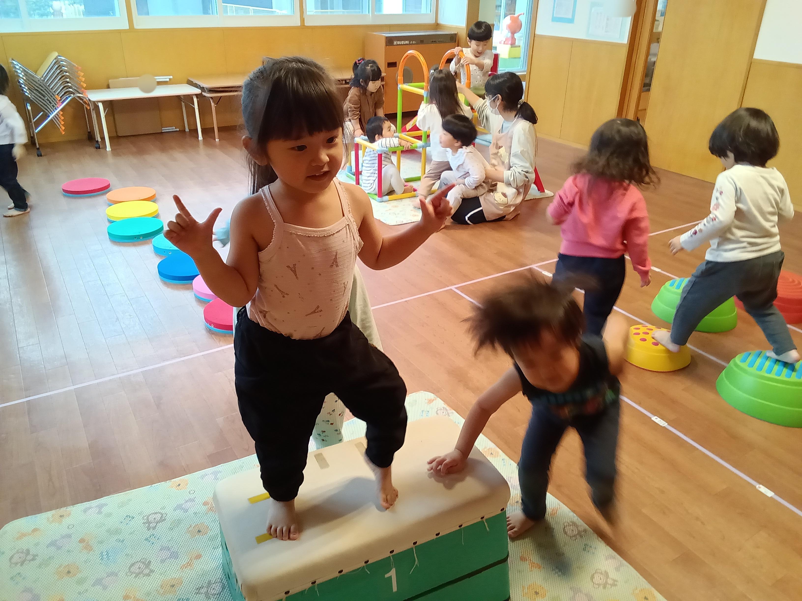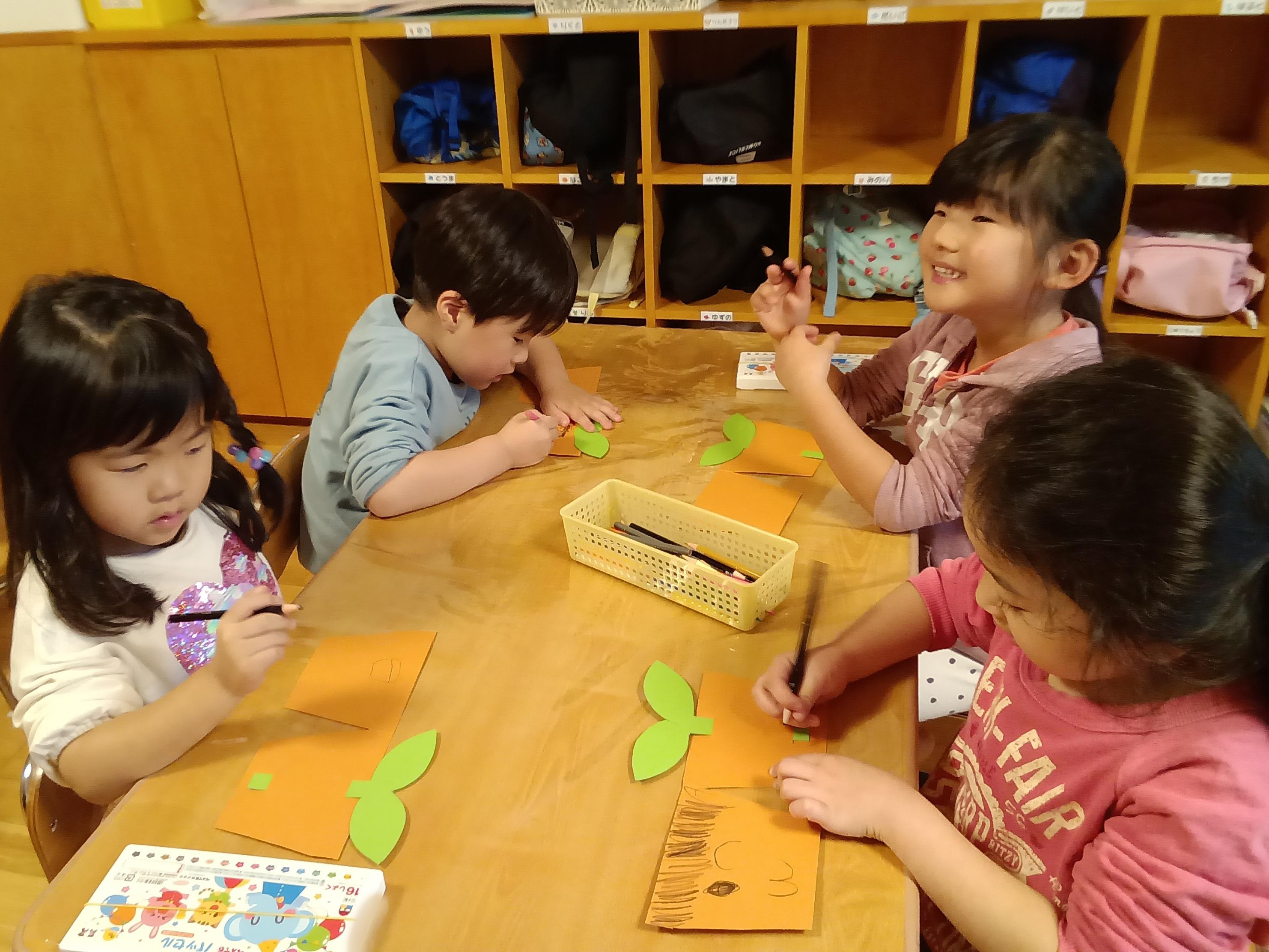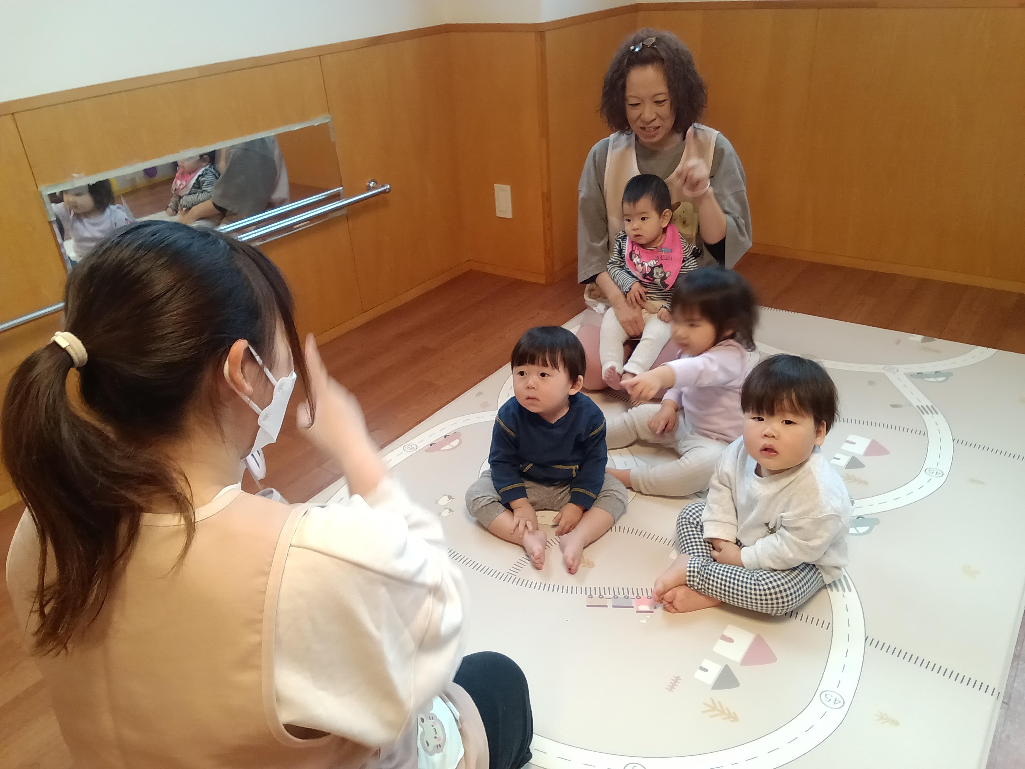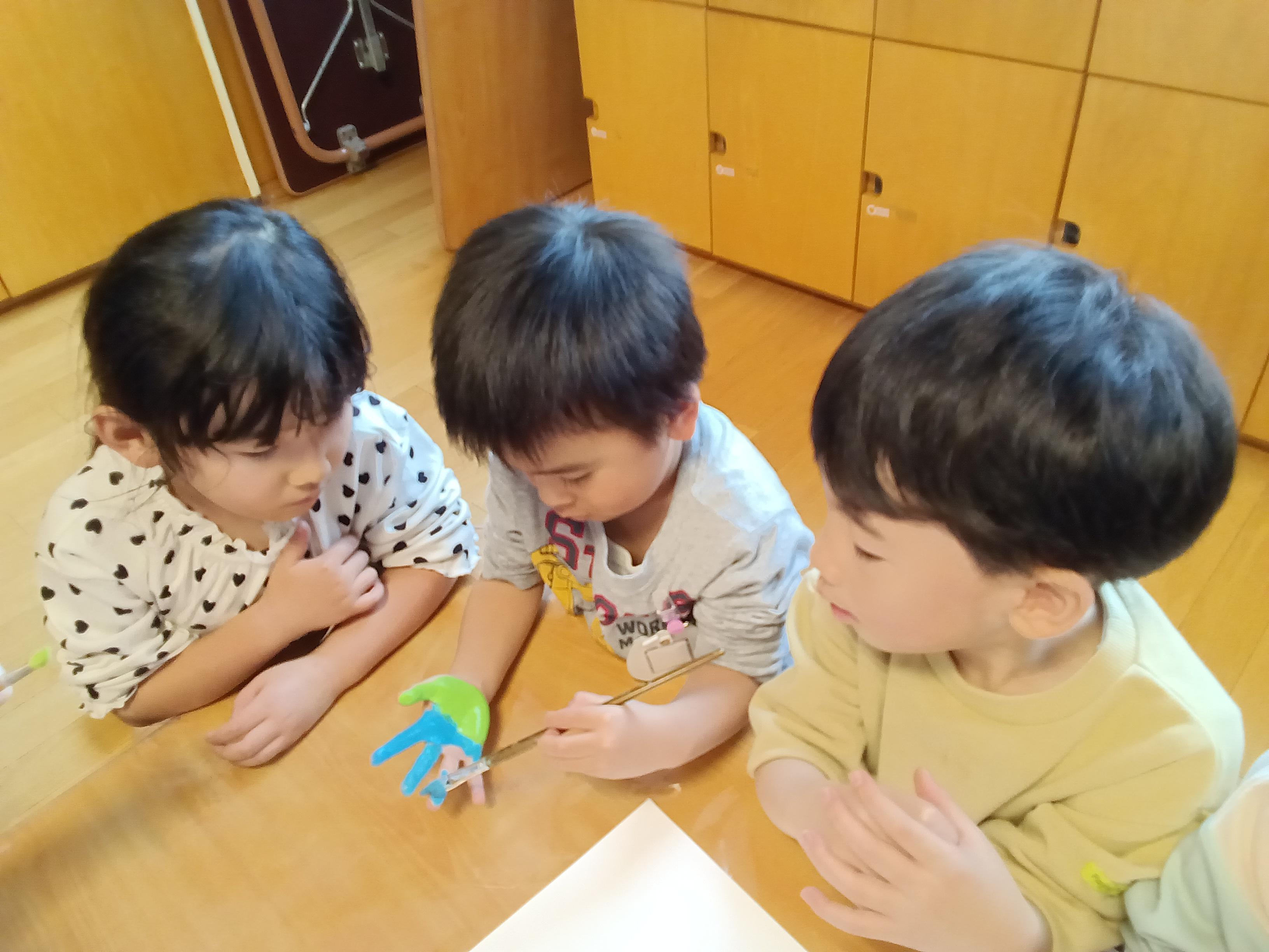 11月6日(水) 勤労感謝の日の制作の様子です🌼好きな色を選び手形スタンプをした後は、絵の具をもっとやりたい!というリクエストで急遽大きな画用紙に指スタンプで絵を描きました🌈ホールで「いろはにこんぺいとう」をして体も動かしました。