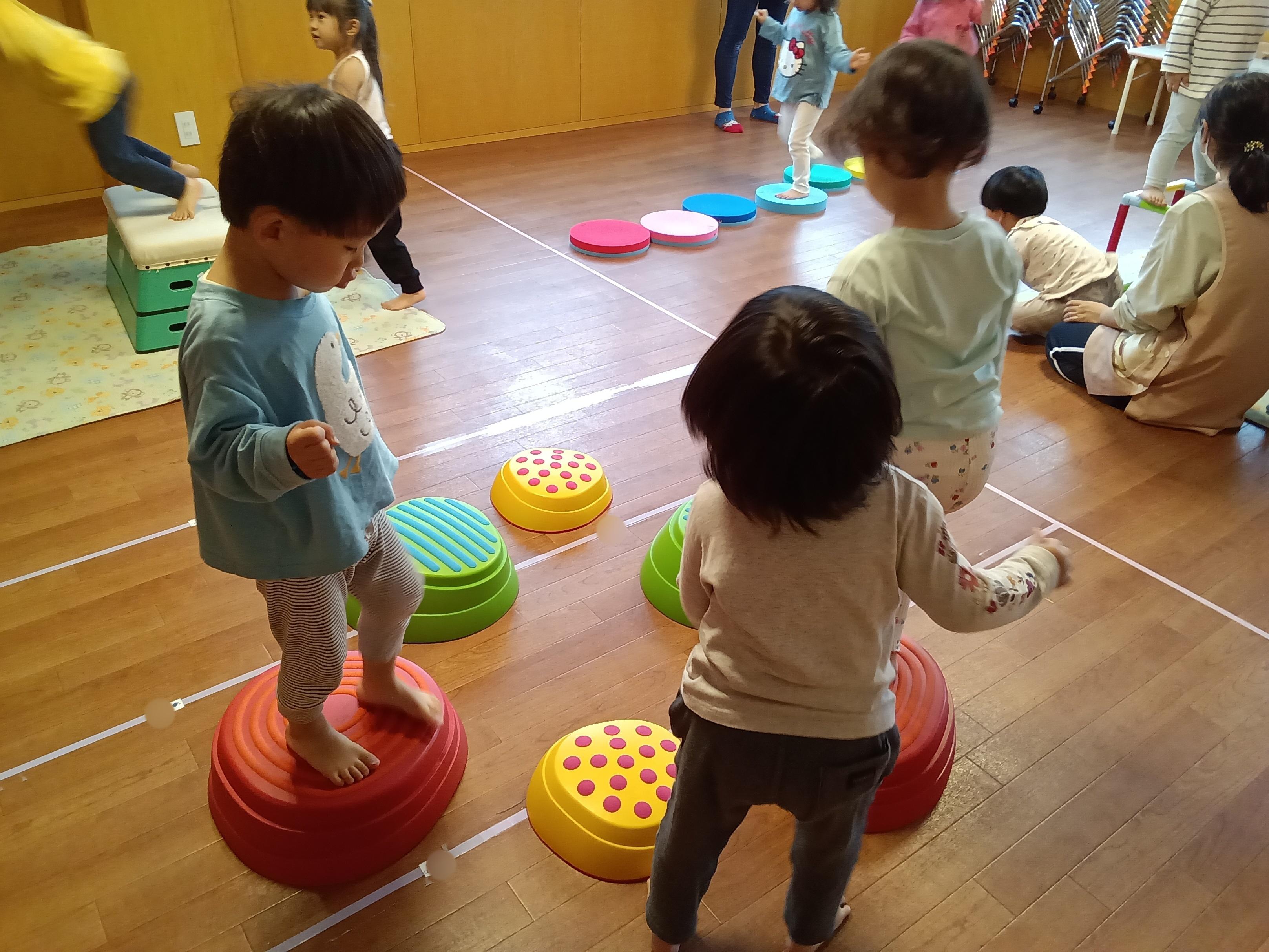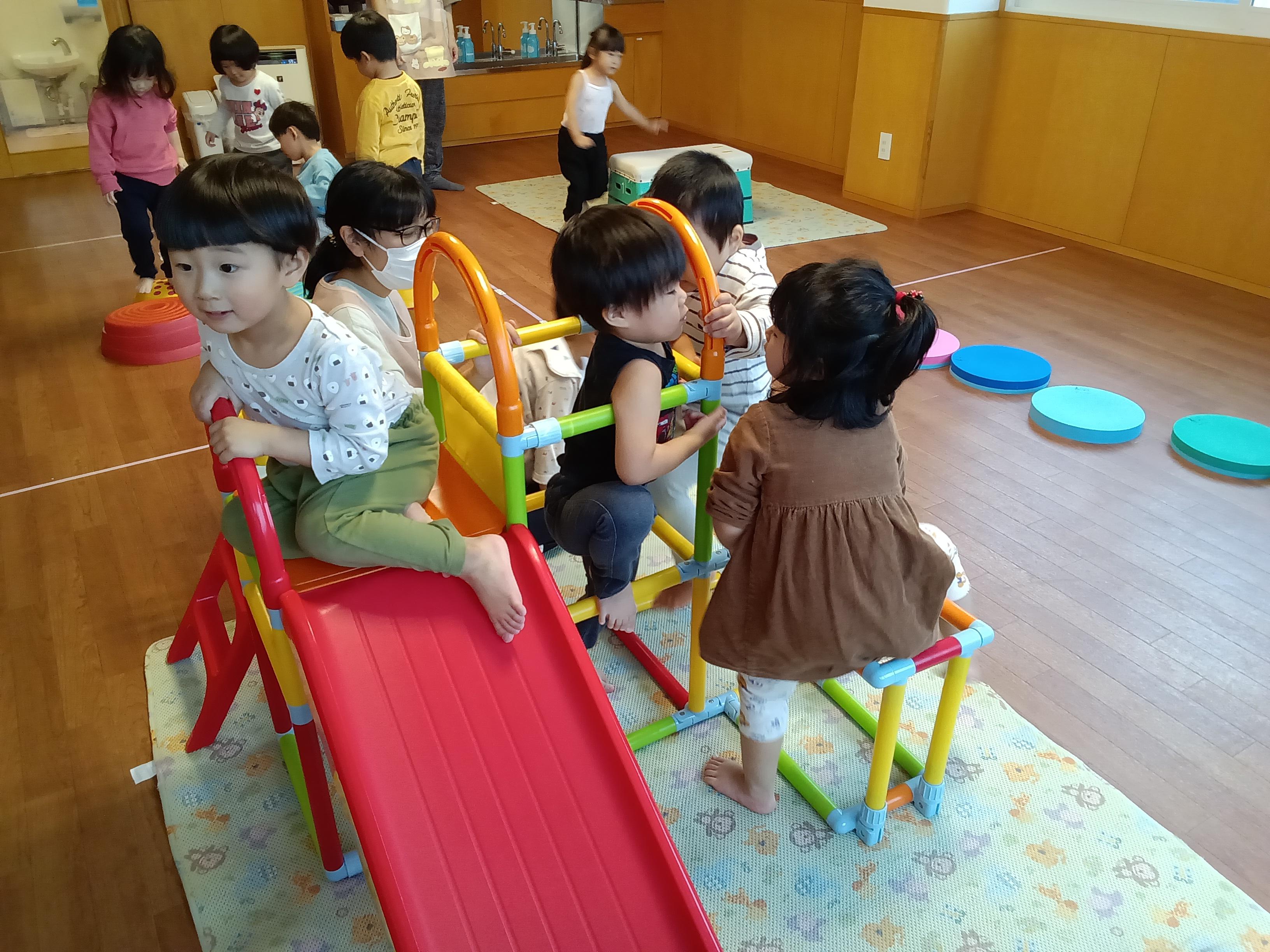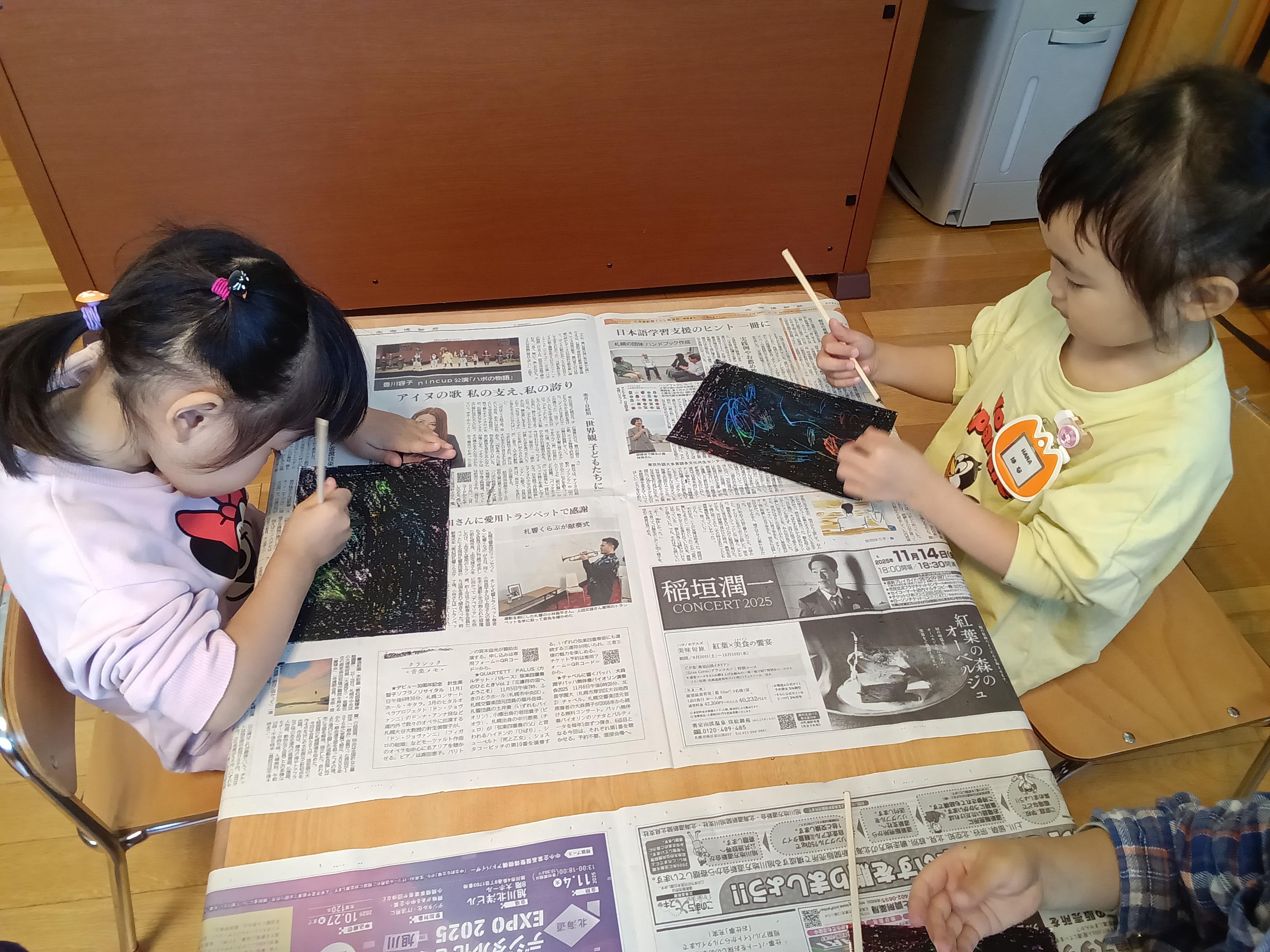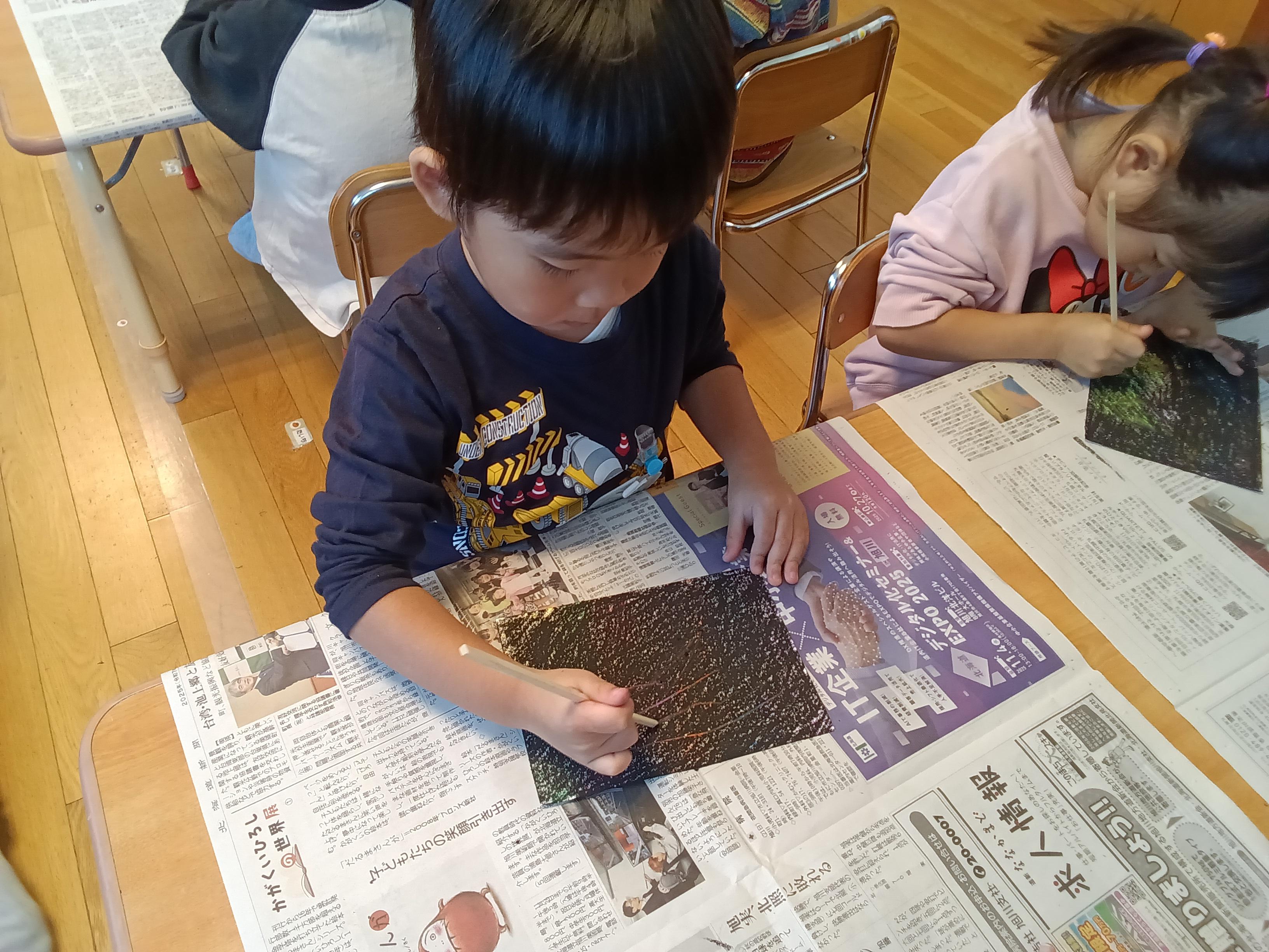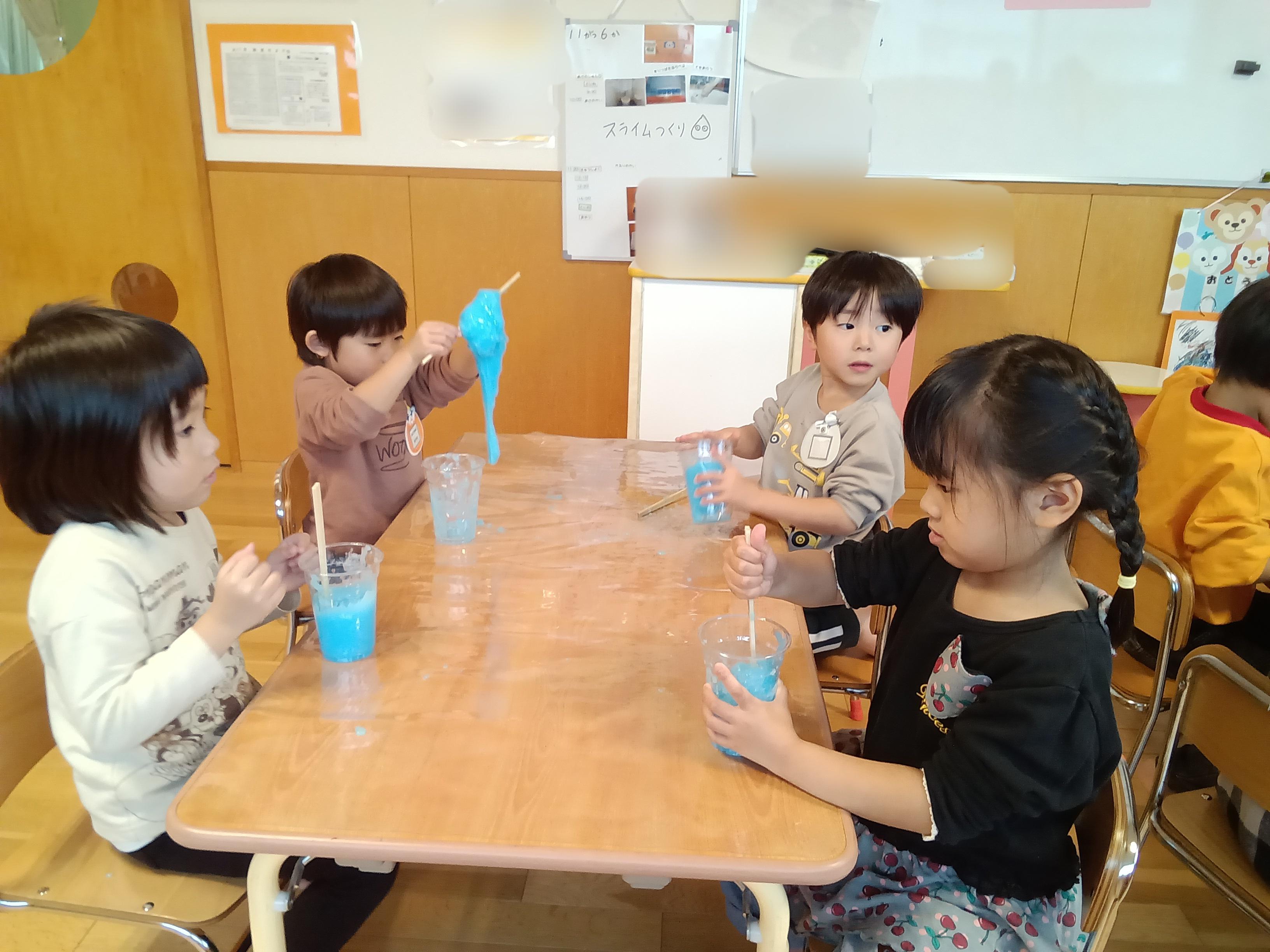 11月6日(水) 勤労感謝の日の制作の様子です🌼好きな色を選び手形スタンプをした後は、絵の具をもっとやりたい!というリクエストで急遽大きな画用紙に指スタンプで絵を描きました🌈ホールで「いろはにこんぺいとう」をして体も動かしました。