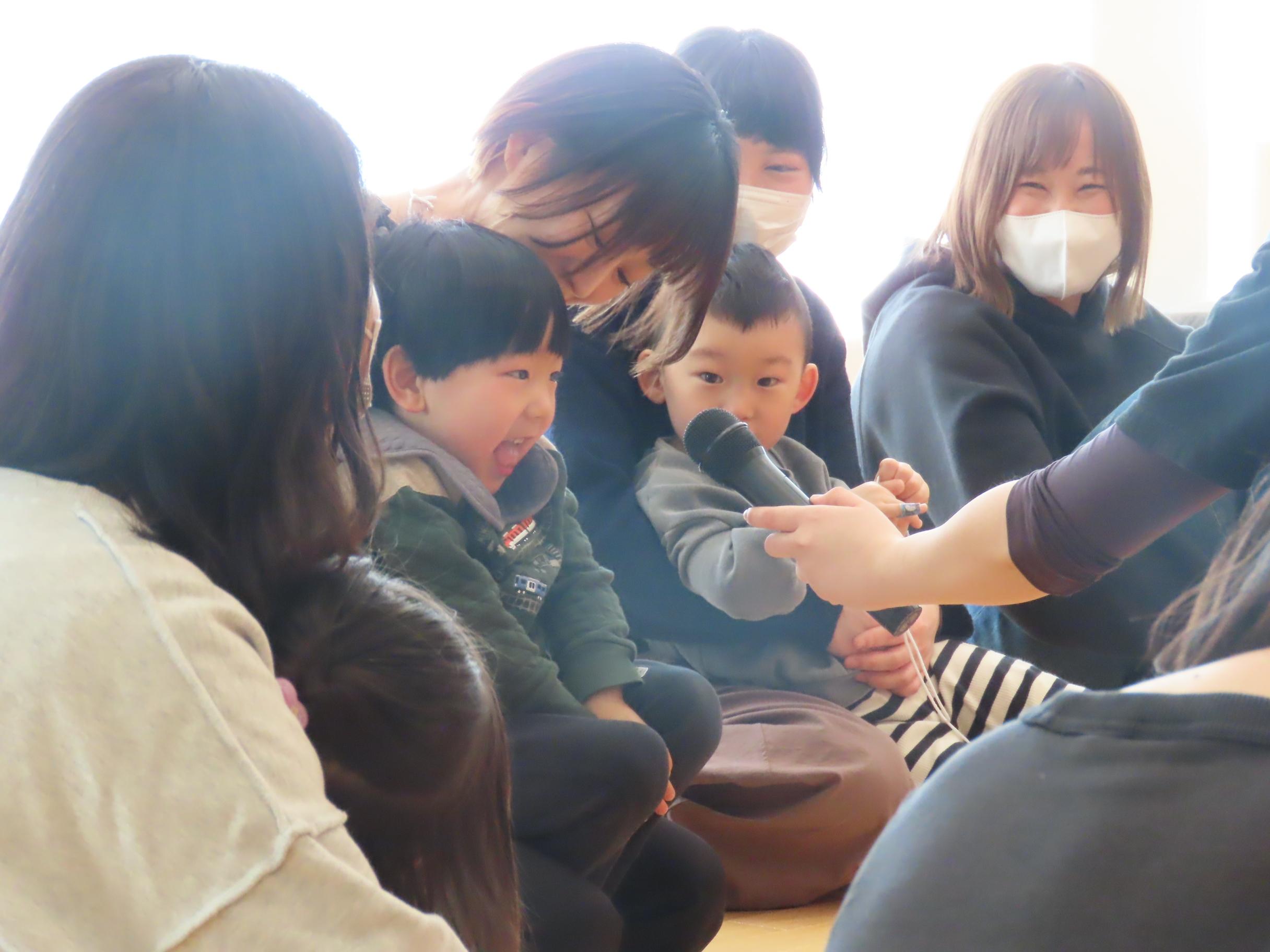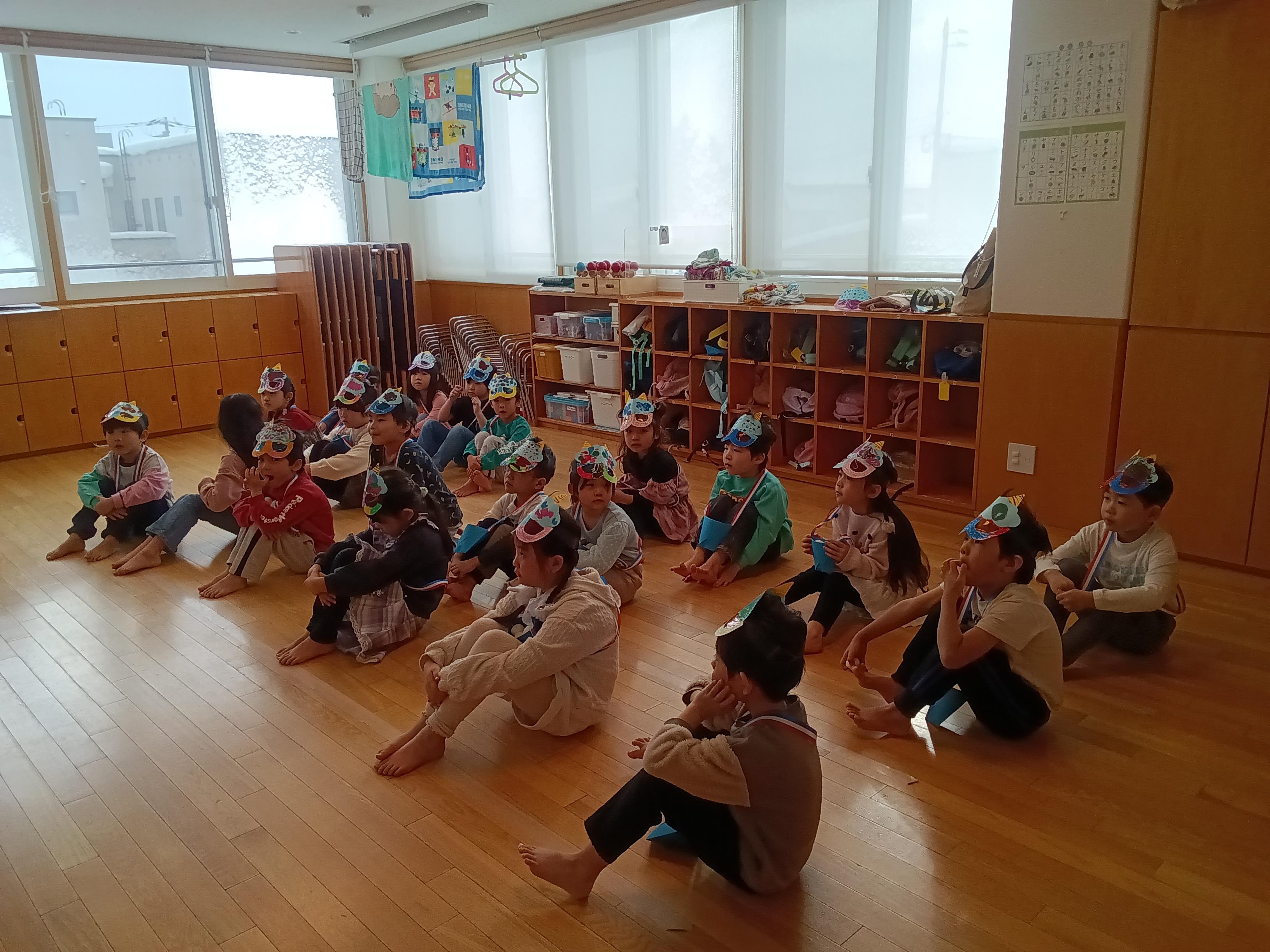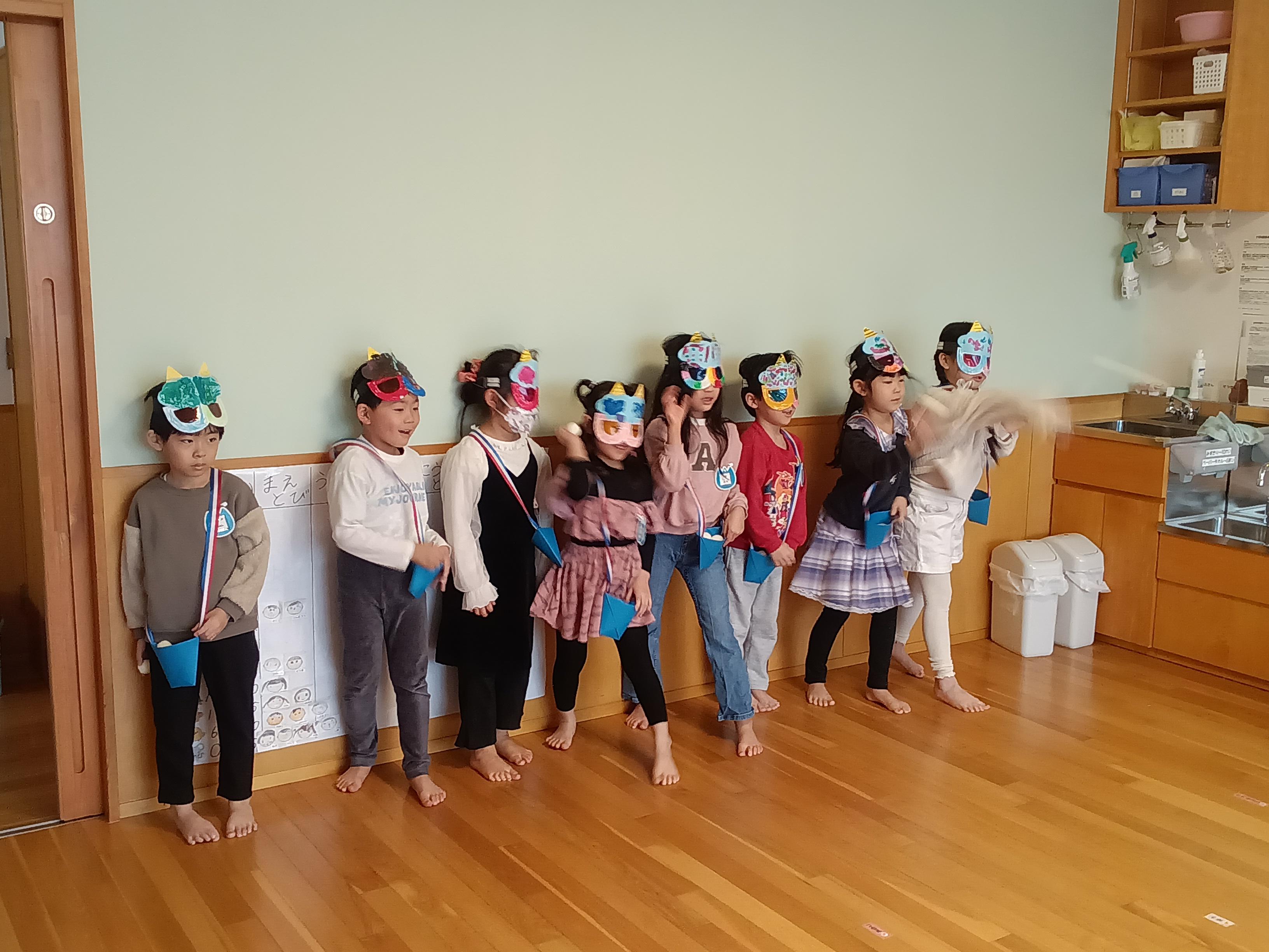 節分の会が始まる前にらいおん組の子どもたちが各お部屋を回って豆まきをしました👹子どもたちの元気いっぱいな「鬼は外!福は内!」の声掛けで邪気を払いましたよ。