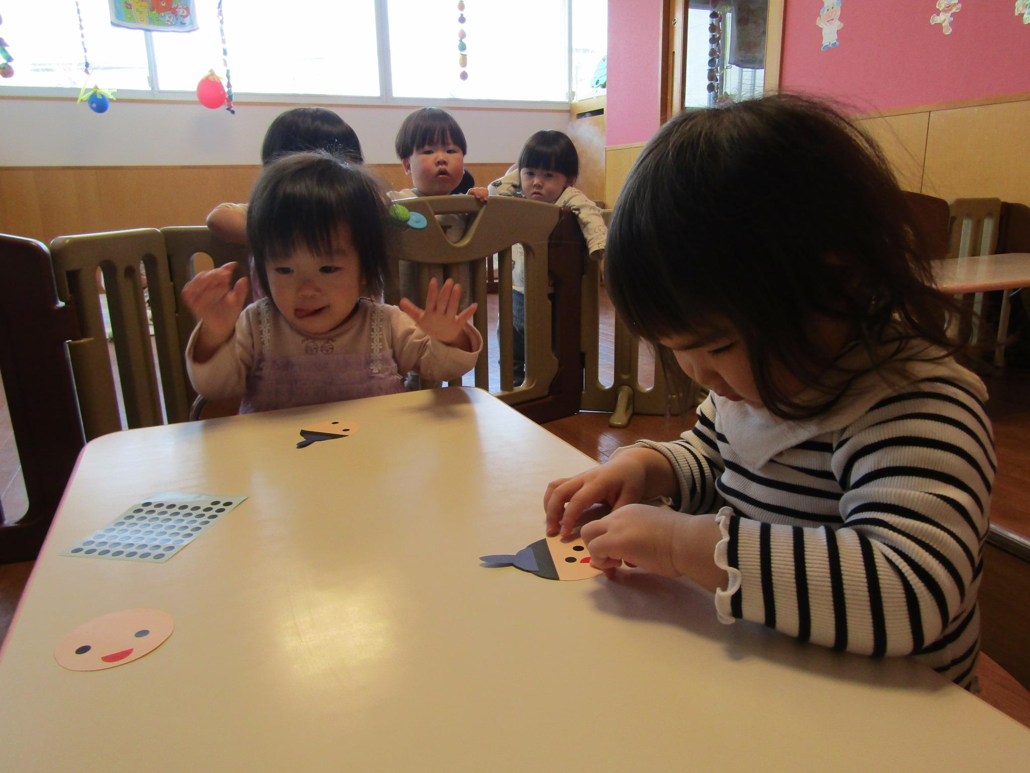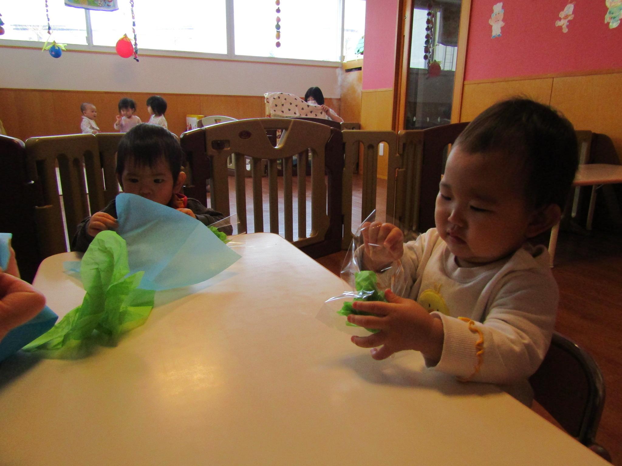 お顔の画用紙にシールで目と口を貼り、着物の部分は色とりどりのお花紙を両手でくしゃくしゃにして袋に入れました🎵お花紙の感触がお気に入りでぎゅっぎゅっと握っていた子ども達でした✨