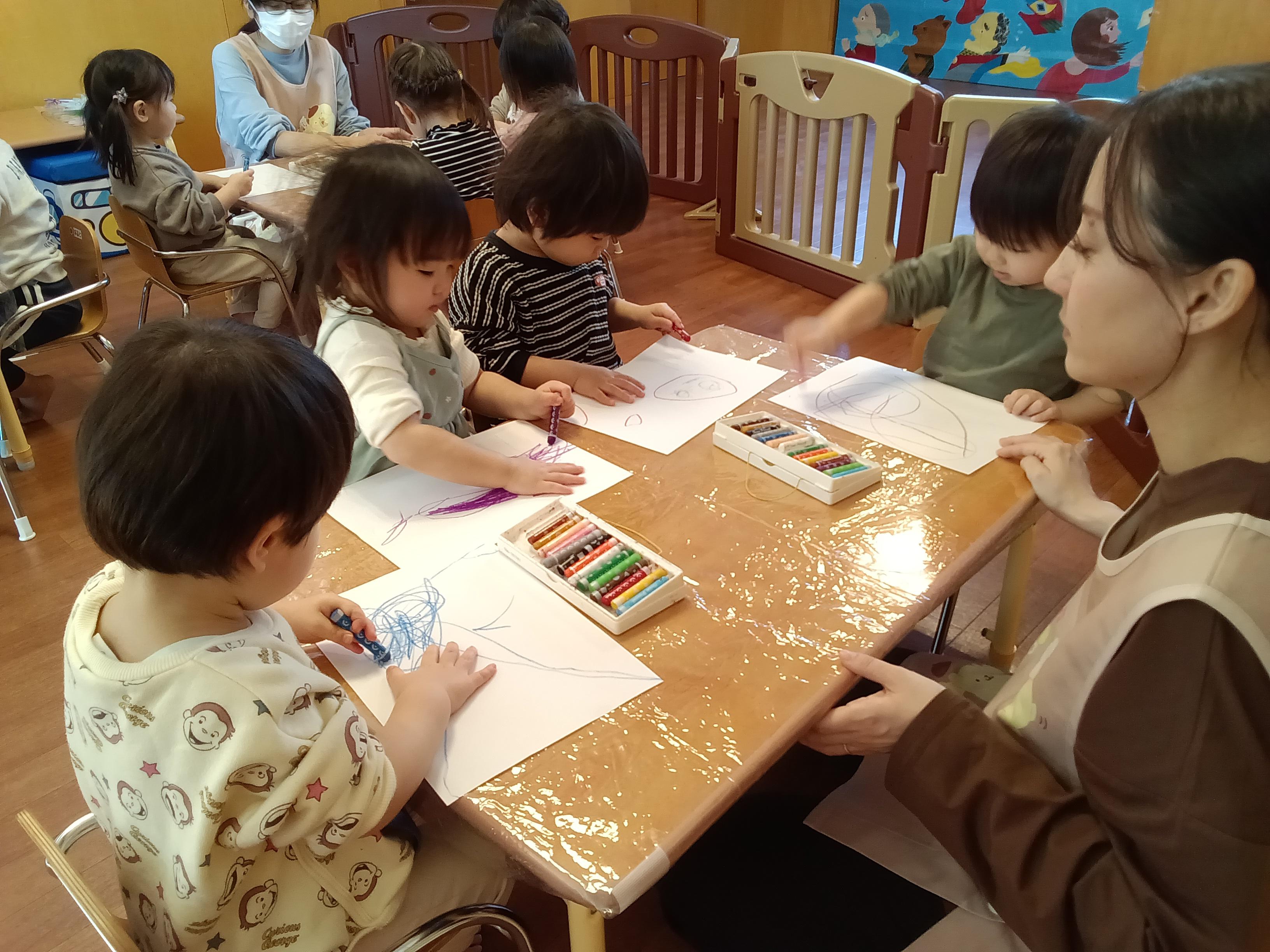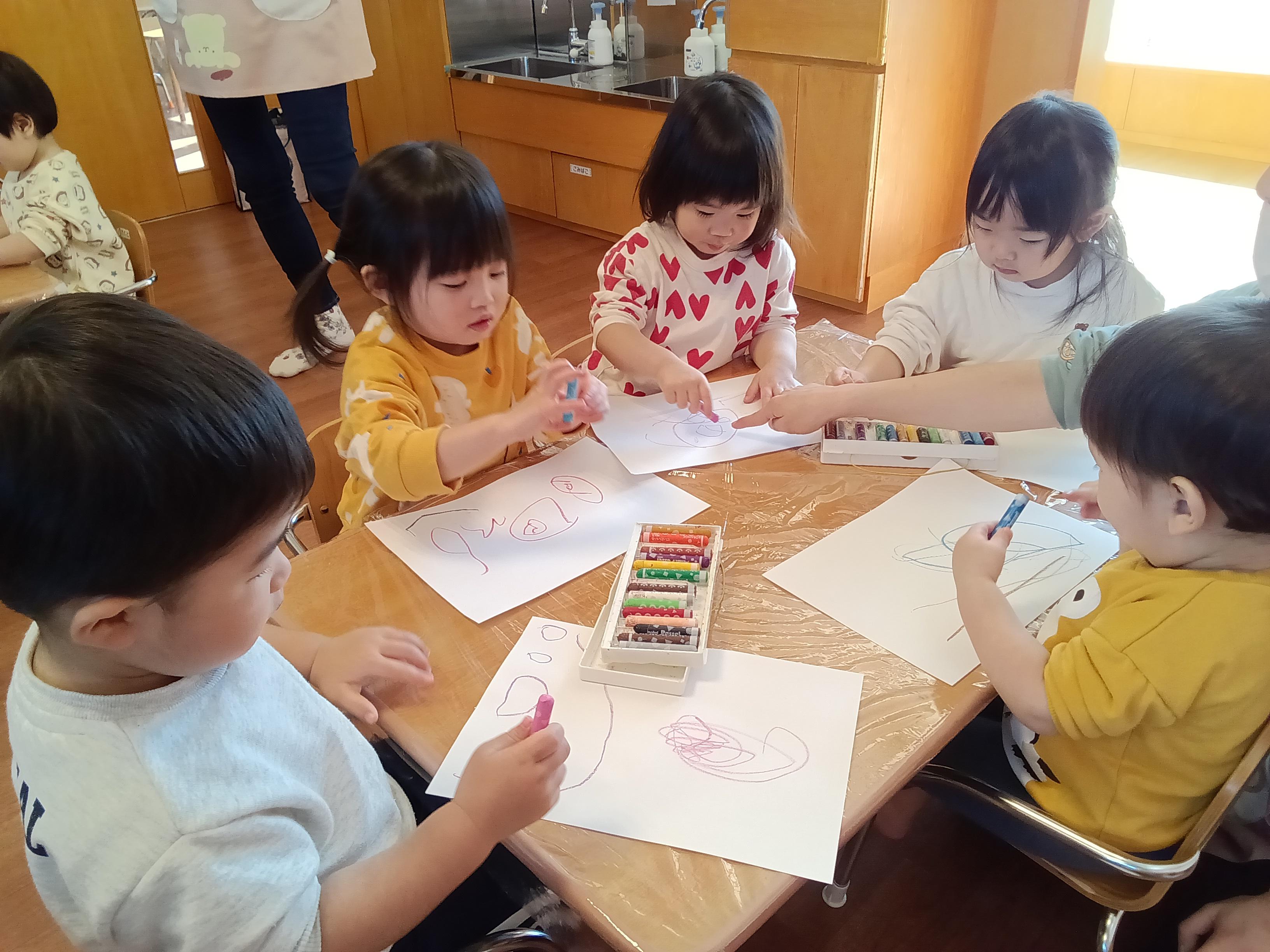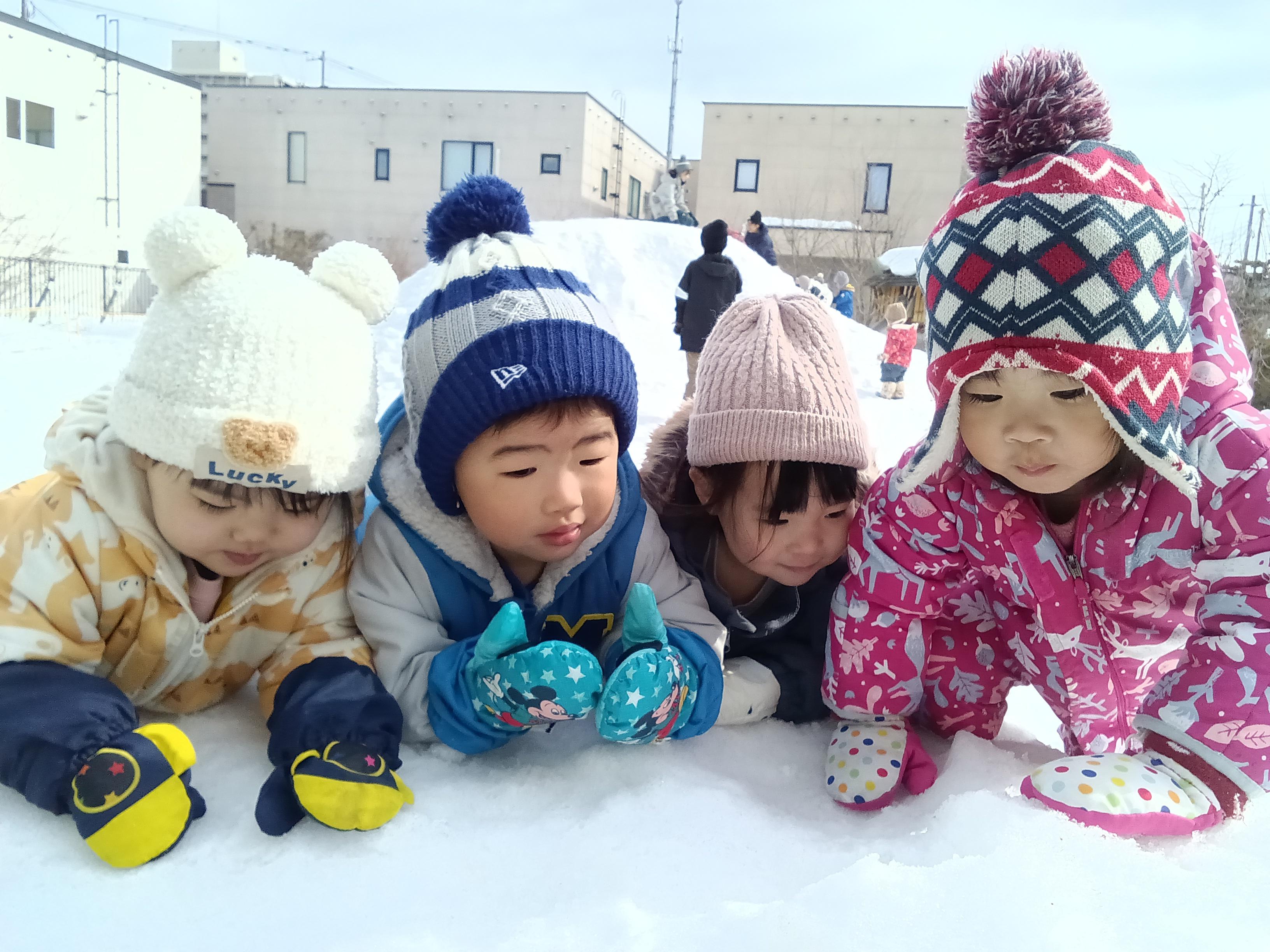 クレヨンでお絵描きや雪遊びを行いました🖍⛄お絵描きは、どの色のしようか選びながら力強く描いていたり、顔を上手に描いているお友達もいましたよ(*^-^*)雪遊びは何度も雪山に登って滑り、体をたくさん動かし楽しく遊びましたよ🎵
