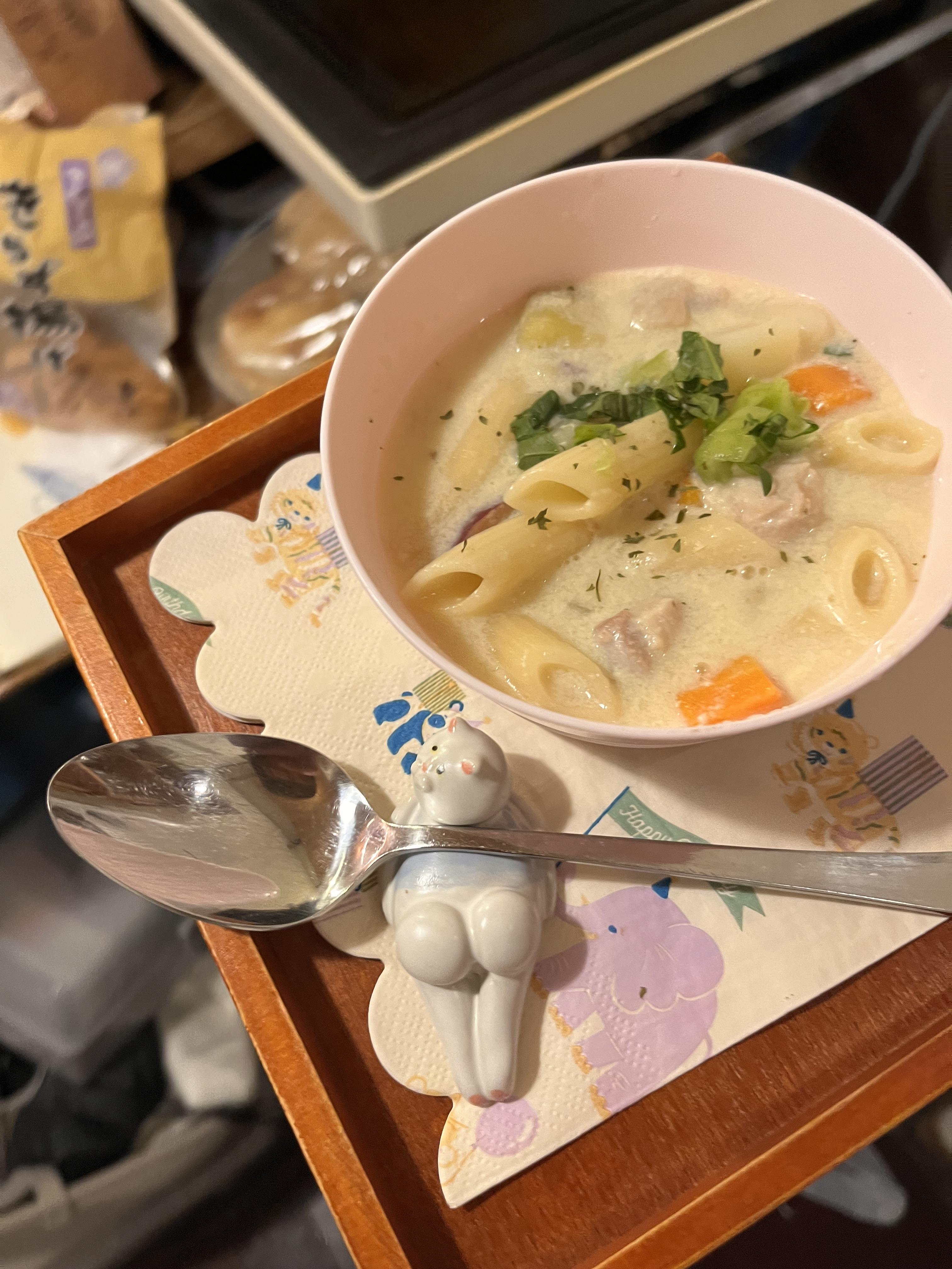 今月のスープ「タラトマコーンの夏野菜スープ〜きっとあなたも好き(ズッキ)ー二💖」という、そんな夏色のスープ。美味しいです🤗(野菜と、鱈のトマト味ね)