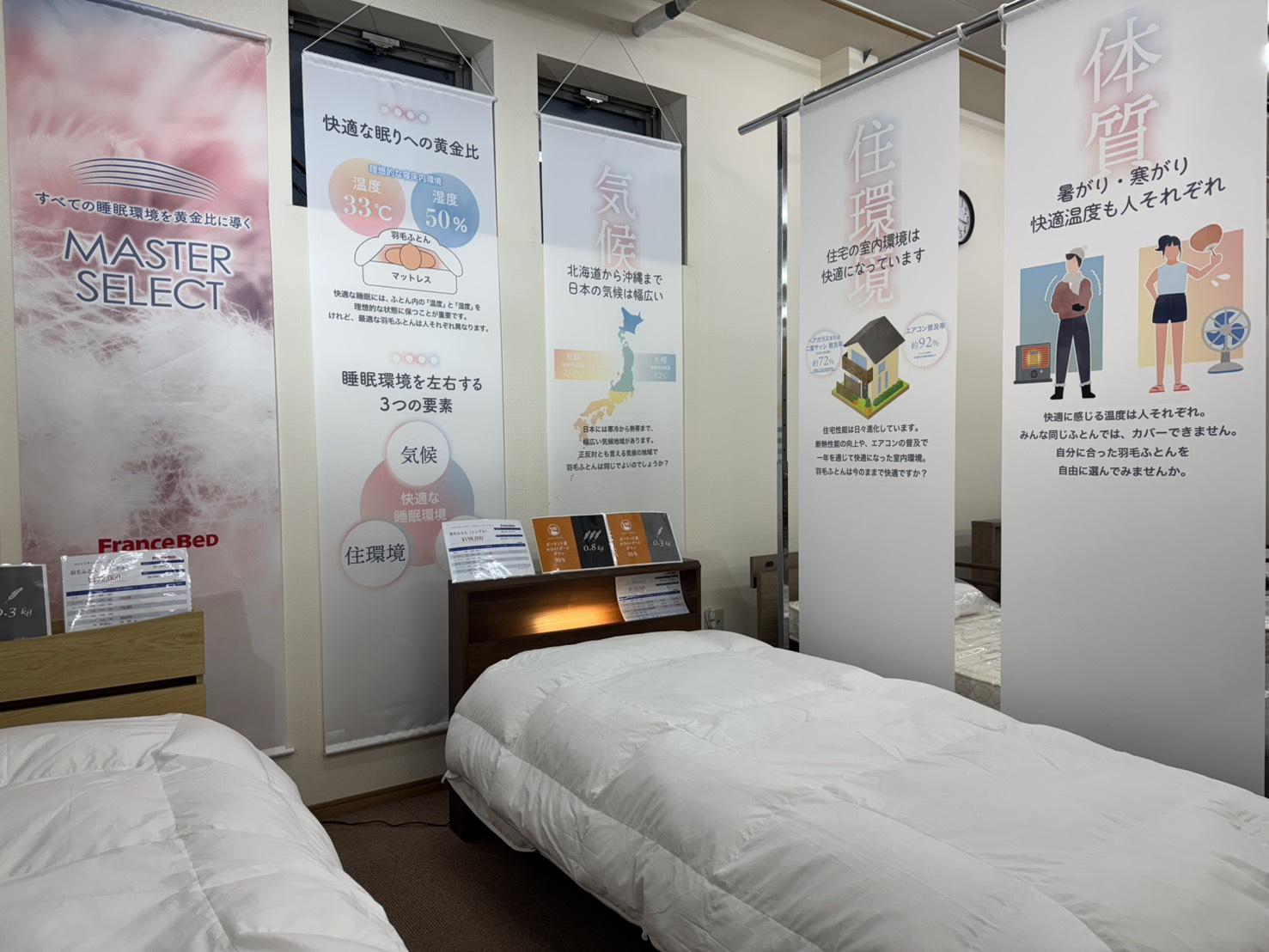 フランスベッド羽毛ふとんは今まで薄掛けと厚掛けの2タイプでしたが、今回、薄掛けと厚掛けの間となる中厚掛けを準備し、お客様の生活環境に合わせて羽毛ふとんを選べる『MASTER SELECT』が誕生しました。