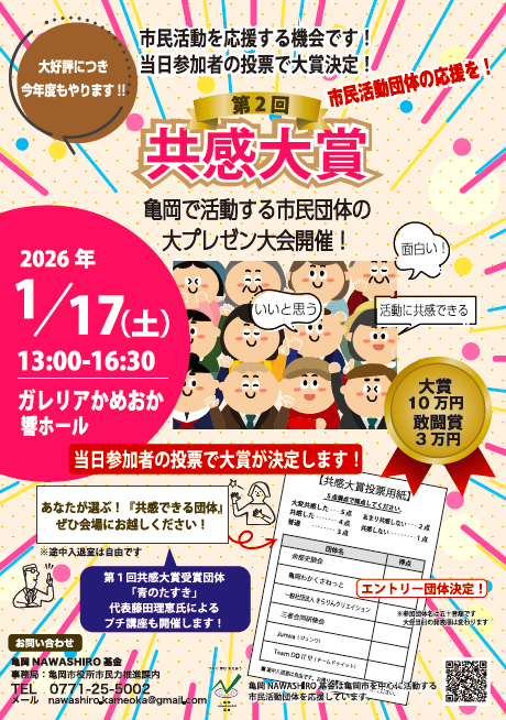 電話:0771-25-5002(亀岡市役所市民力推進課内) メール:nawashiro.kameoka@gmail.com |