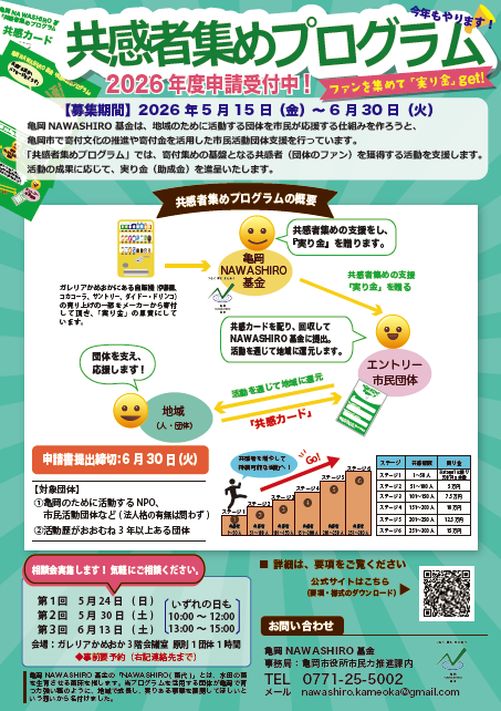 〒621-8501(住所不要)亀岡NAWASHIRO基金事務局(亀岡市市民力推進課内) TEL 0771-25-5002