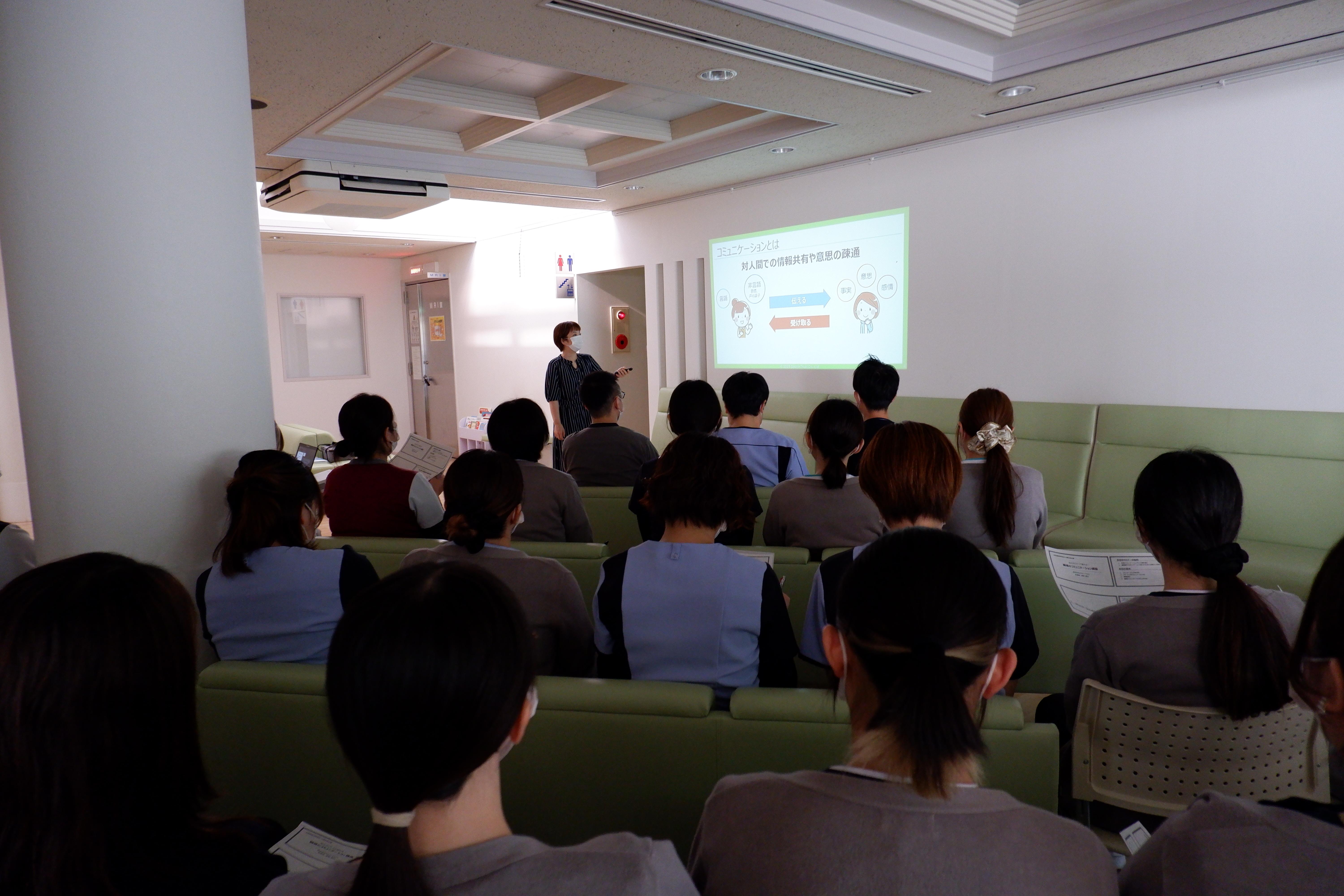 外部から講師をお招きして研修を行うのは初めての試みでしたが、大変分かりやすい講演で、職場だけでなく日常でもとても大切な「コミュニケーション」についてであったため、スタッフも意欲的に聴講し、学ぶことが出来ました。
