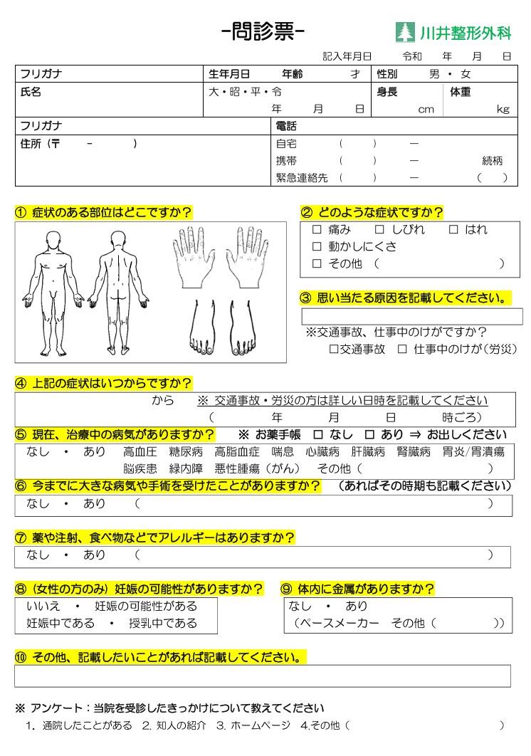 当院に来院後に記載いただくので構いませんが、印刷・記載後のものをご持参いただけると診察までスムーズです。(WEB予約の方はWEB上で問診を記載することが出来ますのでご利用ください)