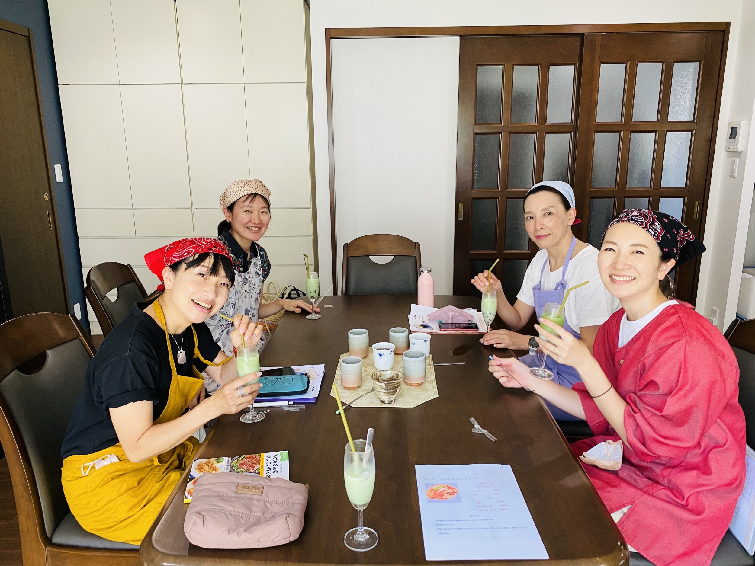 講師Kotoの自宅「kotokitchen」で、素敵なお仲間と語らいながら、その日作った料理を食べる憩いのひと時は、普段がんばっているご自身へのご褒美。心のエネルギーチャージしましょう。