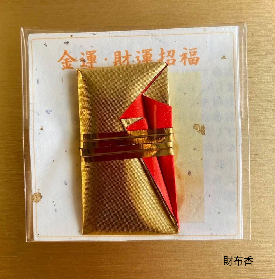 財布香(金色)と大国様と恵比須様の御像を金箔入りの和紙に包んだお守り入り匂い袋です。