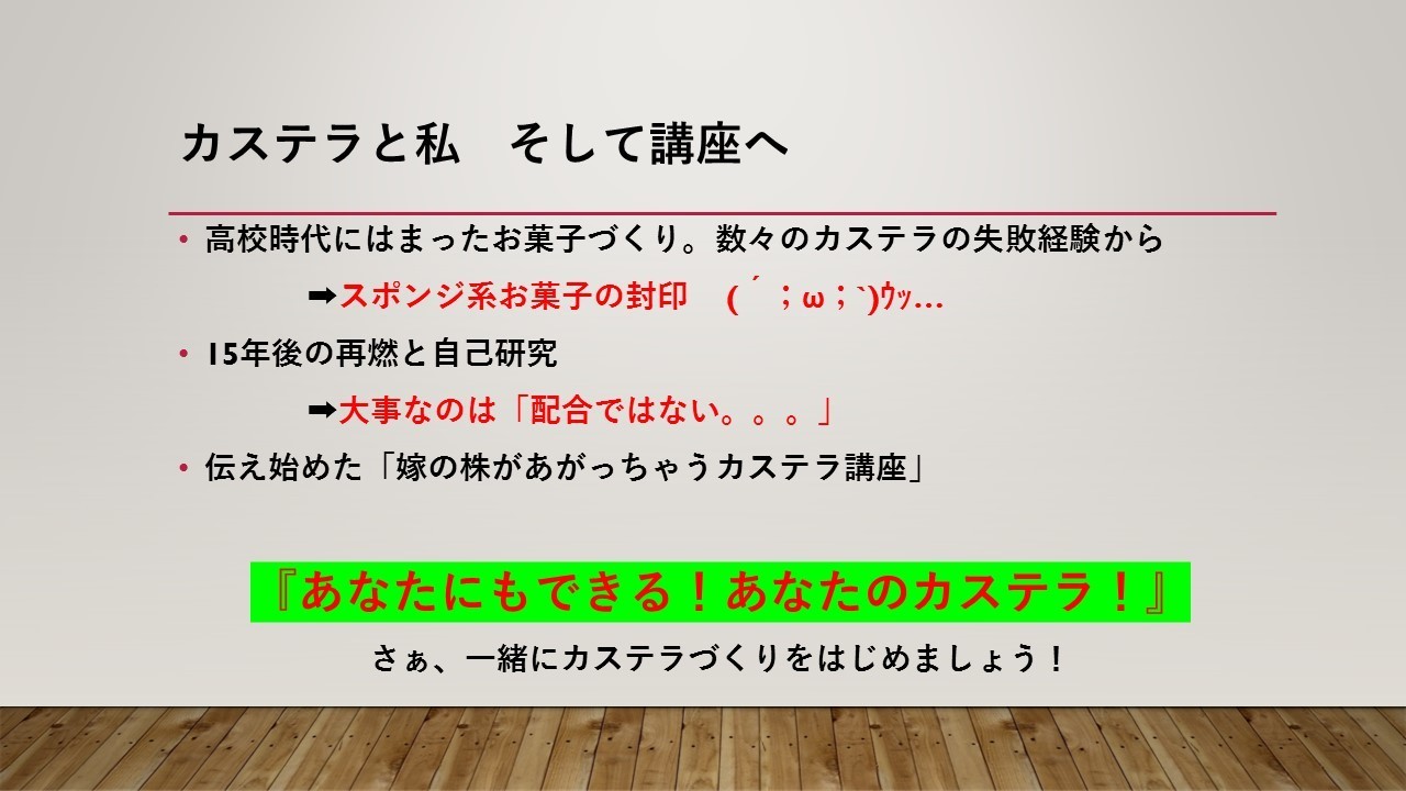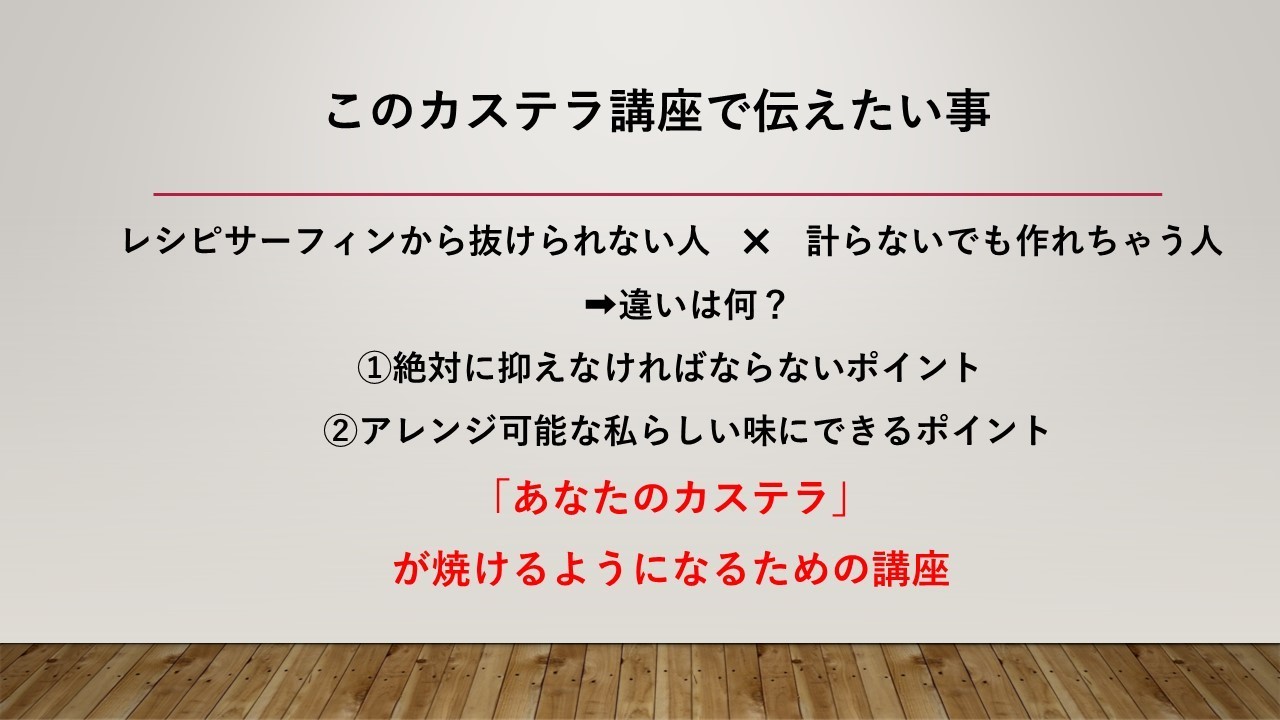このカステラ講座では、私あべれいなのつくる、私のお気に入りレシピのカステラを伝授するのではなく、「あなたのカステラ」が焼けるようになるための、絶対抑えておきたいポイントと、私流にできるポイントをお伝えするものです。