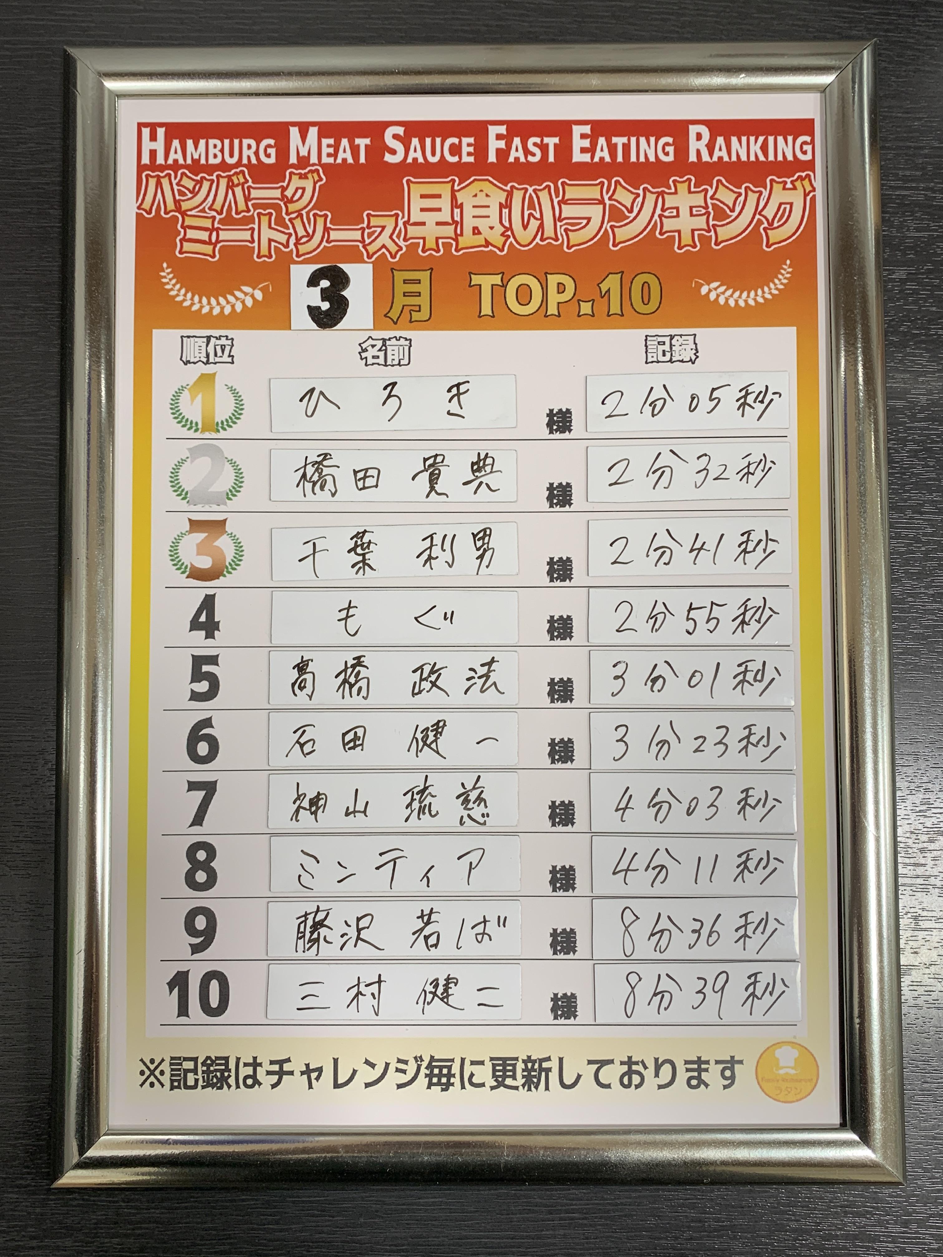 3月の1位の方は全国レベルなのではないか?というほどの記録を叩き出していただきました!「ひろき」様がなんと【2分05秒】という他を寄せ付けない圧倒的なスピードイーターぶりを魅せつけてくれた回となりました。
