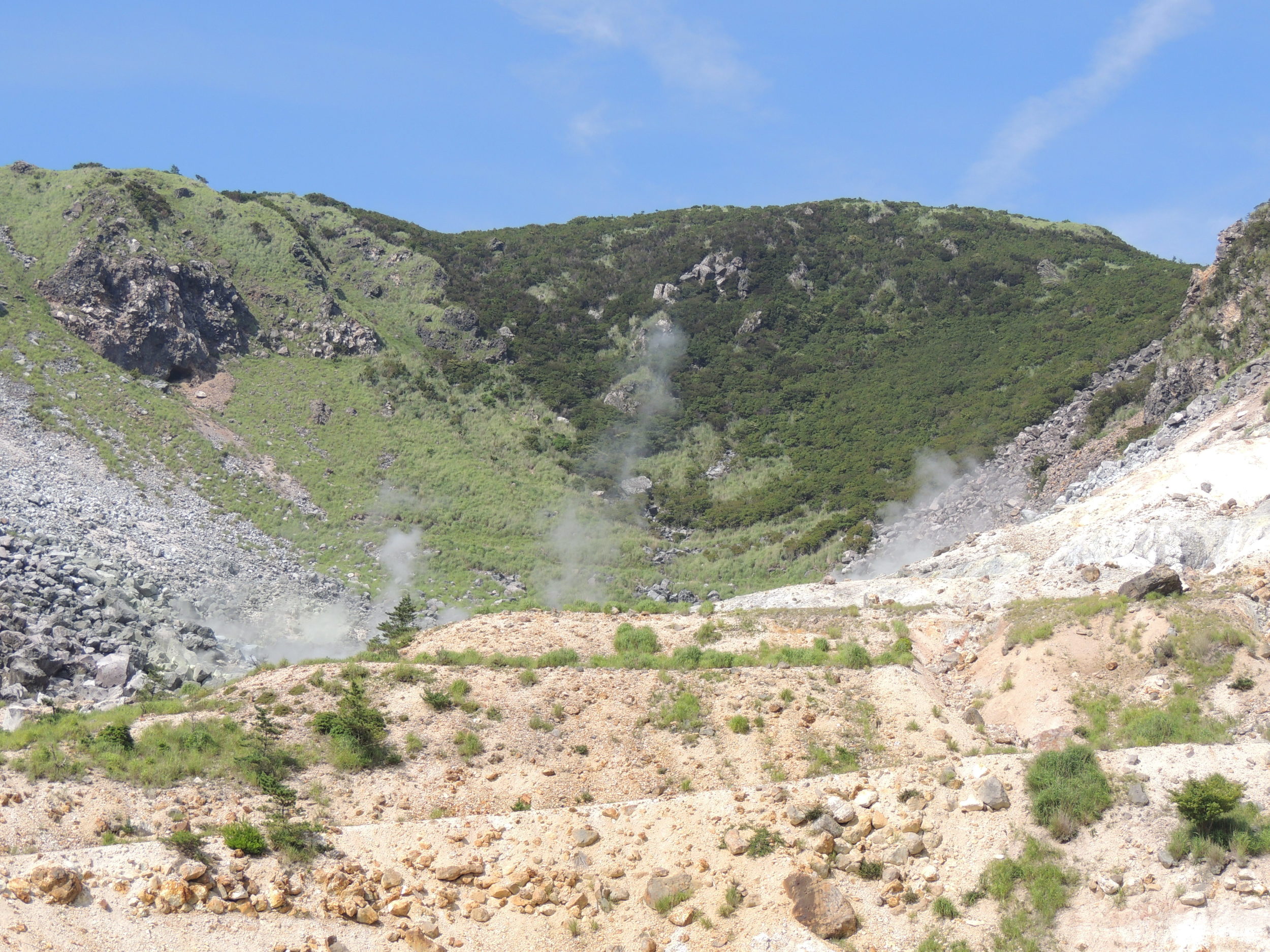 冷鉱泉の湧出源である伽藍岳(がらんだけ)は、大分県由布市にある成層火山の活火山です。標高は1,045mで、別名を硫黄山といいます。中腹には直径300mの円弧状の火口地形があり、常に活発な噴気活動をしています。伽藍岳は1200年前と1000年前に小規模な水蒸気爆発が発生し、867年(貞観9年)に噴火した記録があります。火口がある周辺はかつてのシリカの露天掘り鉱山跡で、珪酸白土鉱床が「別府白土」の名称で採掘されていました。