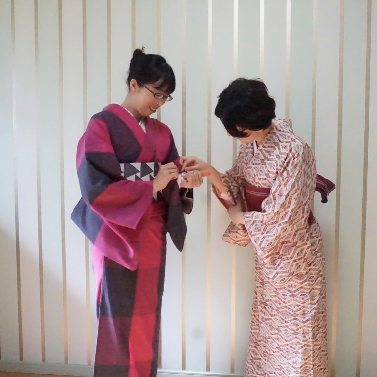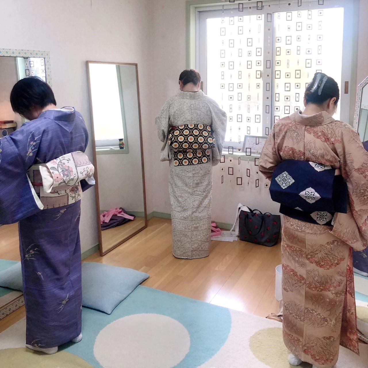 久しぶりに着ようとした時にうまくいかなかったり、帯結びだけアドバイスが欲しい、半衿の縫い付け方を見てほしいなど、生徒さんが課題に感じていることをそれぞれ練習できる場になっています。