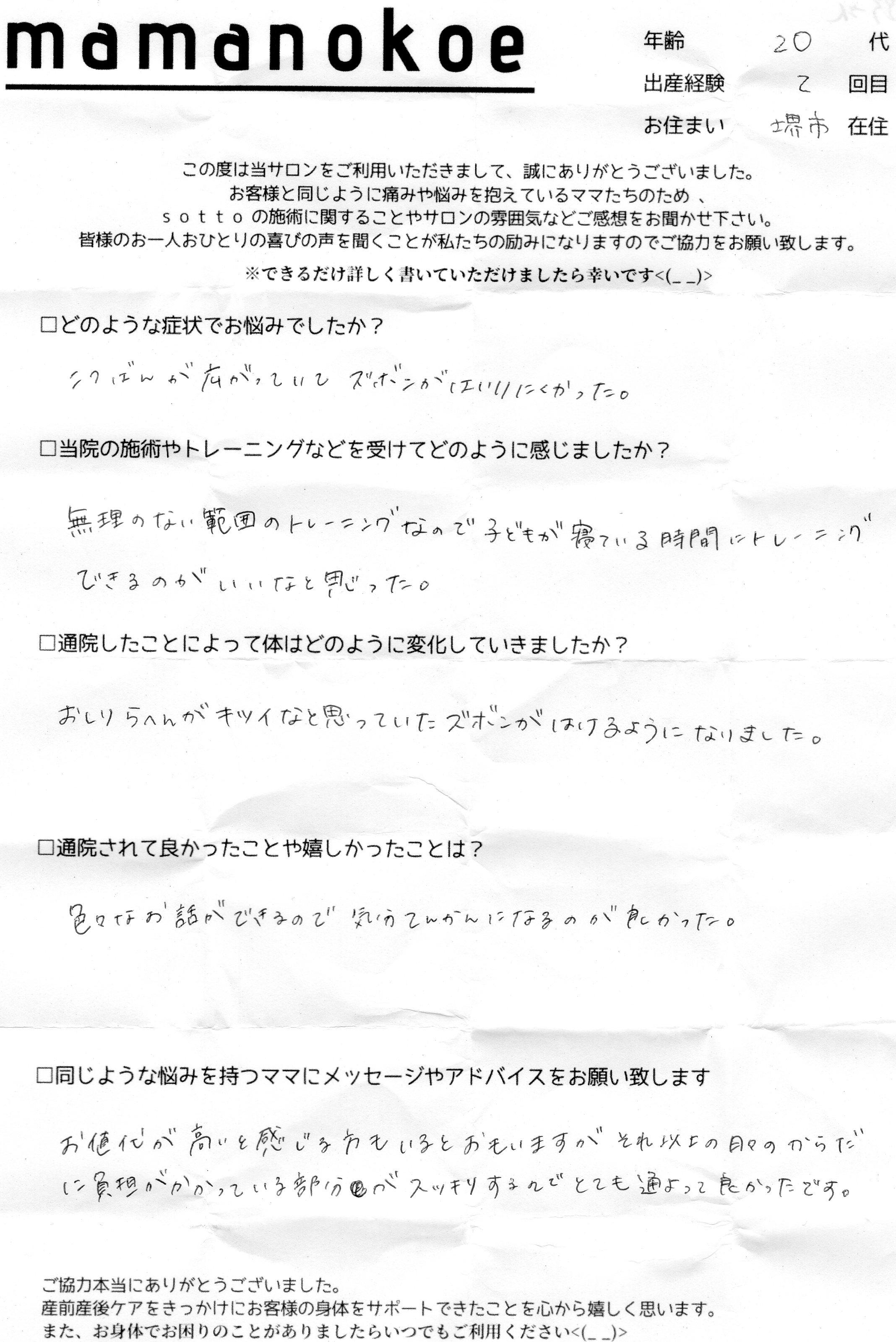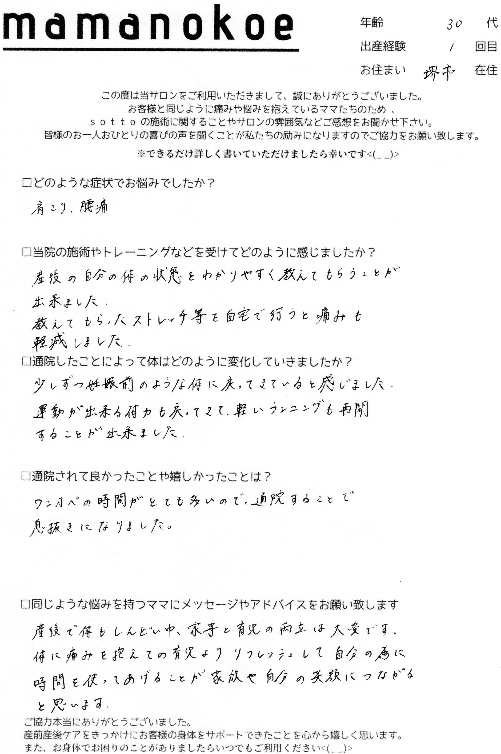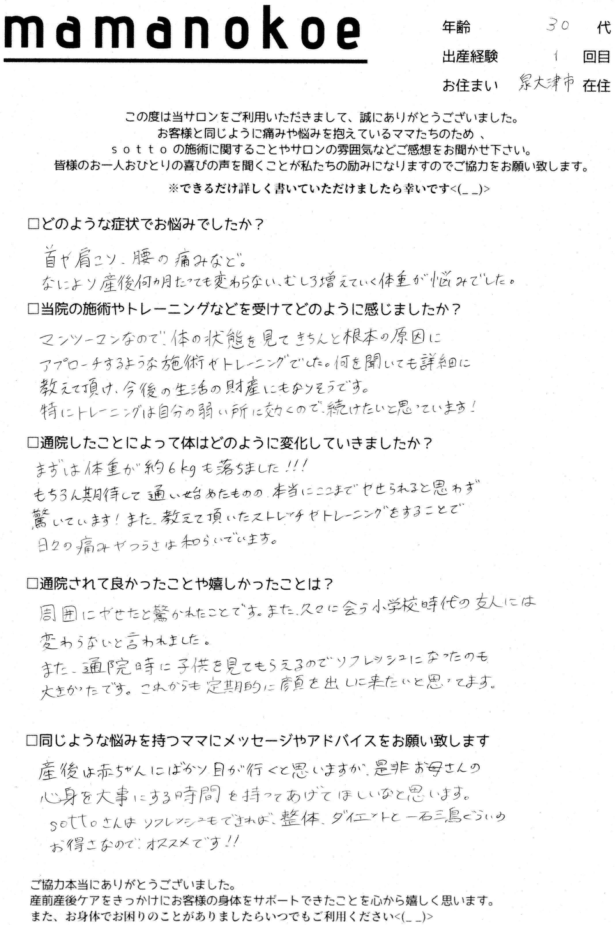 産前産後のサロンということもあり一つ一つの痛みが日頃の生活につながっているのが分かりやすく教えて頂き、時々意識できるようになりました。何年もできなかったあぐらを組んだり寝る姿勢も自由自在になりました。これから肩がどうなっていくか…など不安もありますが来て良かったです。ありがとうございました。