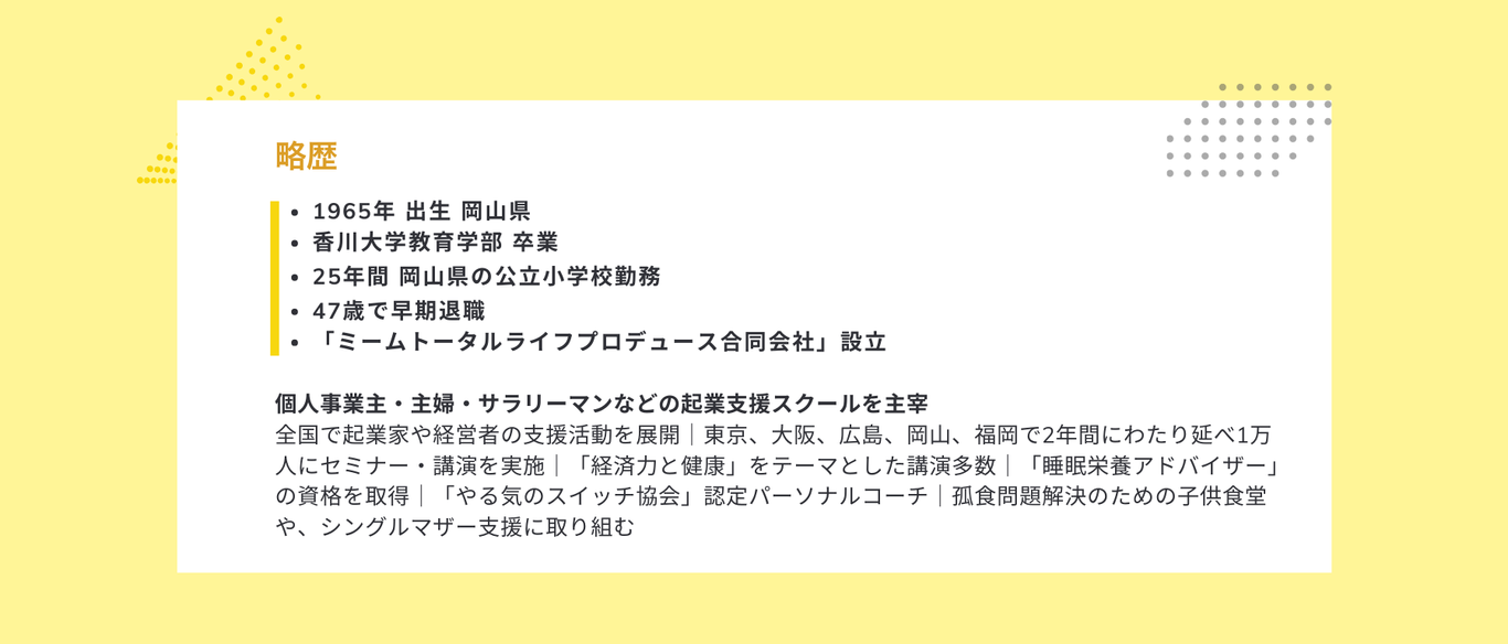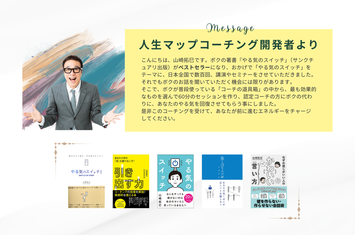 テクニック的な「やり方」ばかり追求し、ある程度までの年商にはなったが、そこから増えなくなりました。この人生マップコーチングに出会い、自分の「あり方」、人としてどう生きるか?親としてどう生きるか?など、根っこの部分考えさせていただき業績が上向きになっています。やはり、自分の成長が一番ですね。