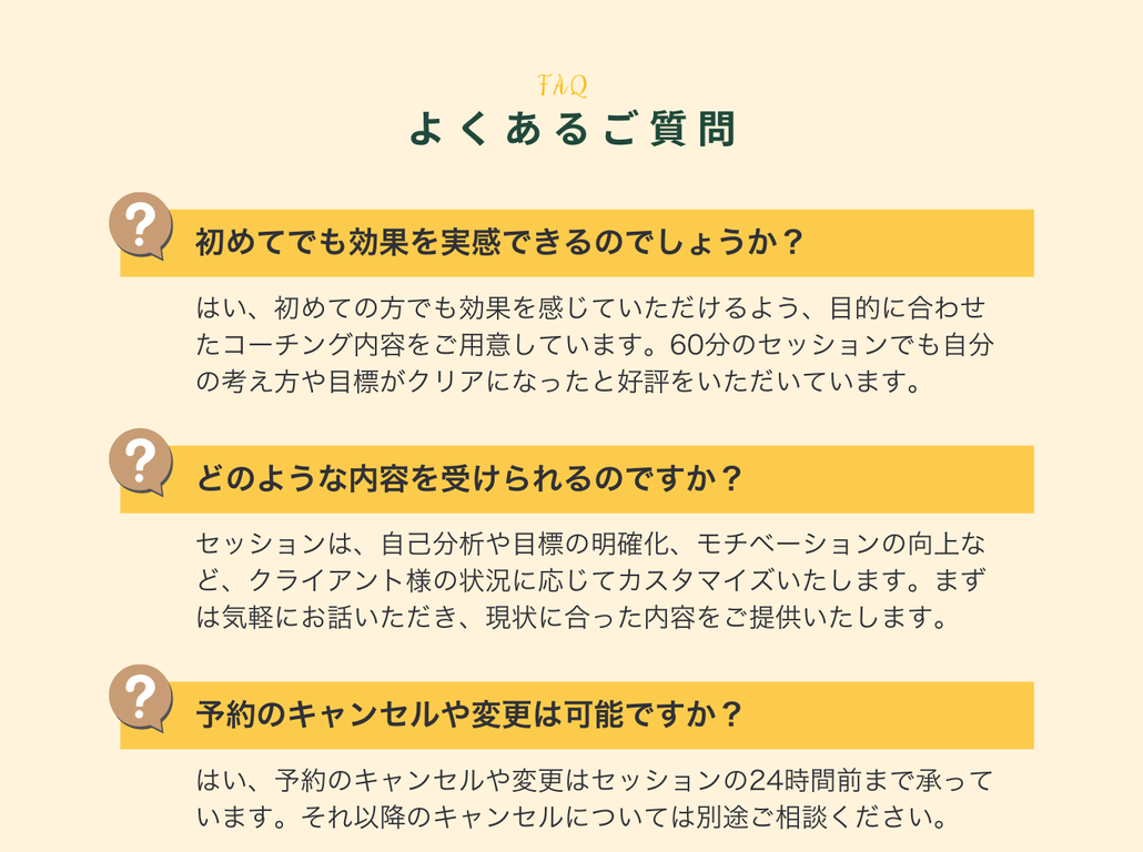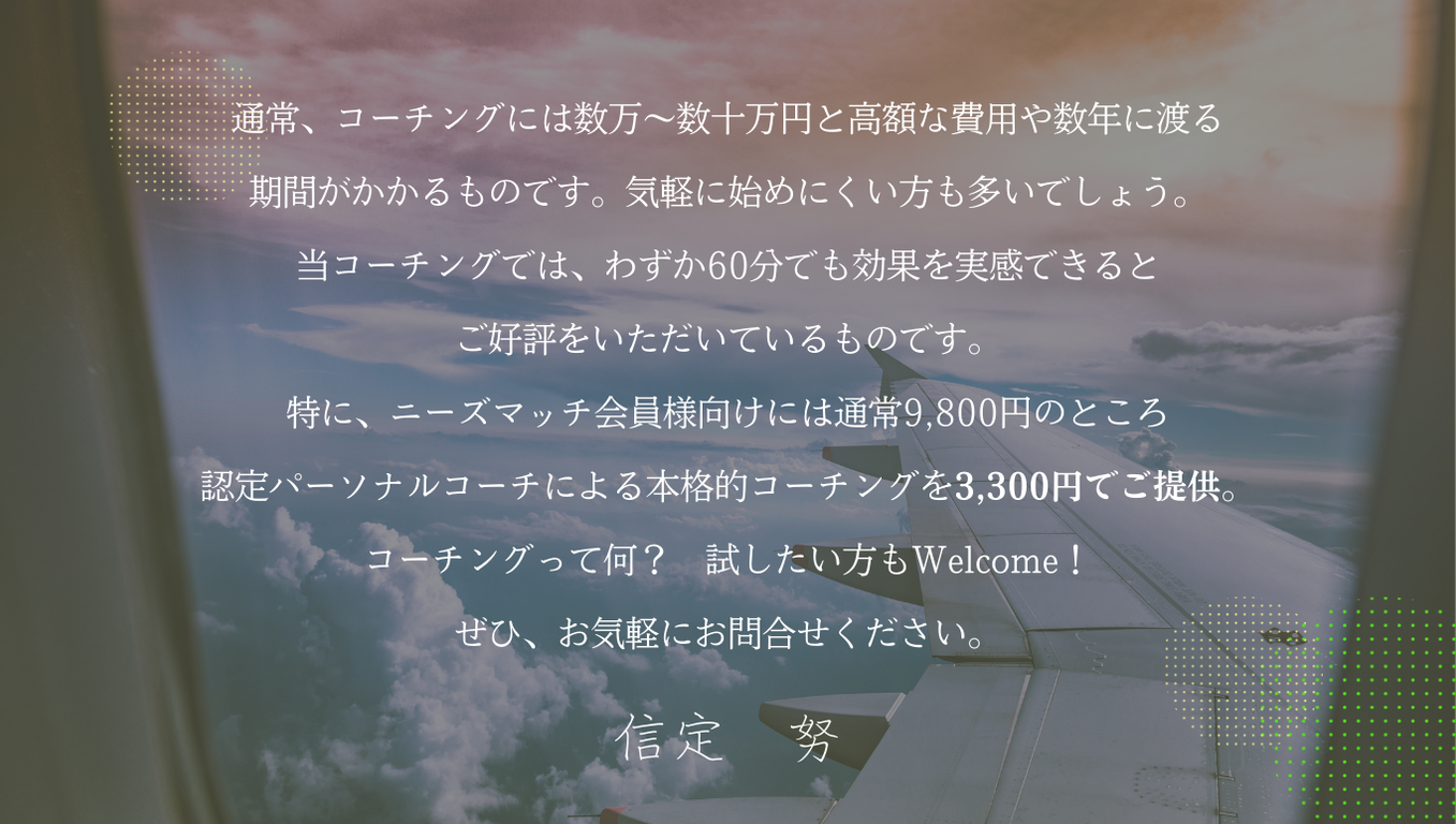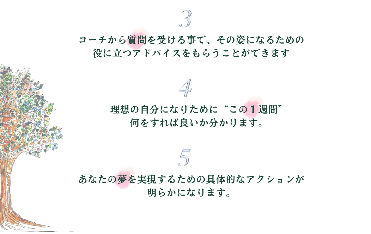 お客様で絶えず予約がいっぱいで日々忙しく、1日があっという間に過ぎて行く毎日でした。体力的にもこの仕事を続けるのは限界があります。コーチの質問によってこれから将来の事を考えて、何を大切にするべきか、優先順位は何なのかが分かり、未来がワクワクに変わりました。
