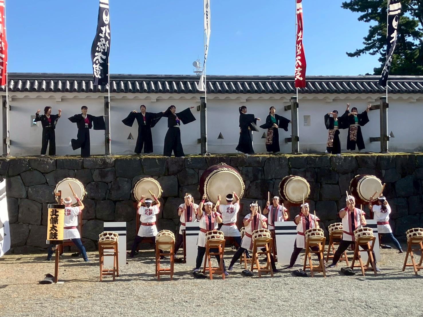 桜の時期は終わってしまいましたが、この日も多くのお客様が城址公園を訪れており、太鼓の演奏を聴いていただきました。