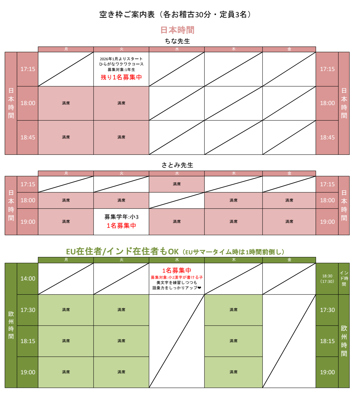 火曜日17時15分~17時45分(2026年1月より新開講。残り1名)